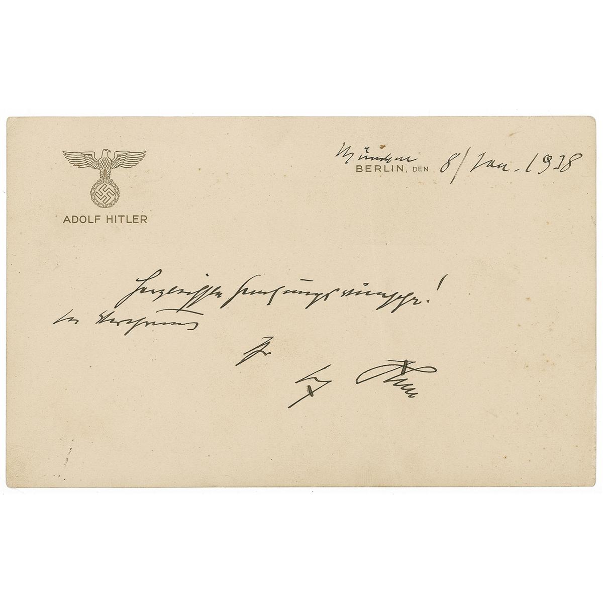 Rare ANS in German, one page, 7.75 x 5, personal letterhead, January 8, 1938. Brief get well note to an unknown recipient. In full: “Warmest wishes for a speedy recovery! Dearest Regards, Adolf Hitler.” In fine condition, with vertical crease affecting first letter of last name of signature, and a bit of scattered light foxing.