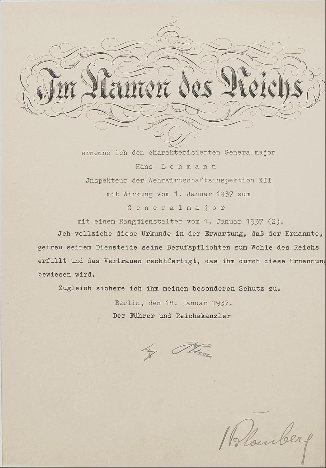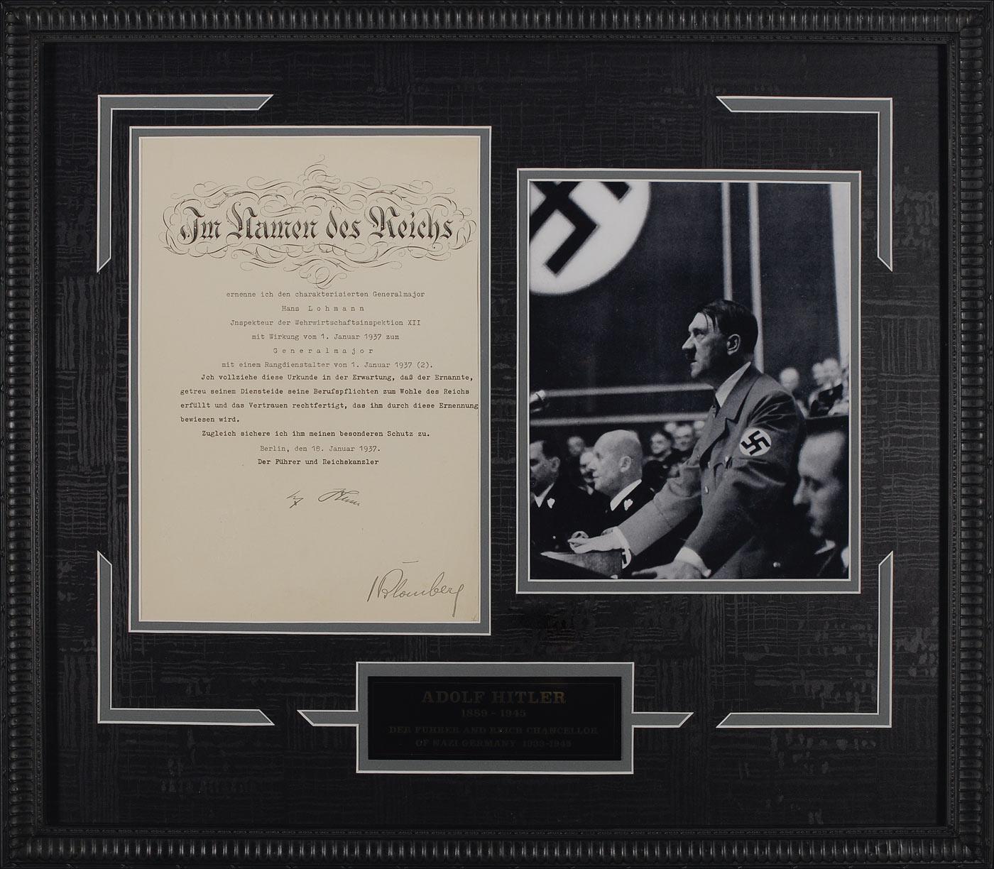 DS, one page, 8 x 11.5, January 18, 1937. A partially printed and typed document promoting Hans Lohmann to the rank of general-major. Countersigned by German Field Marshal Werner von Blomberg. Elaborately double-matted with a photo of the Nazi leader and a small placard then framed to an overall size of 23.75 x 21. In fine condition, with a few subtle dings and wrinkles and embossed seal just touching Hitler’s signature. A unique document as Hitler recognizes one of his high-ranking officers. Oversized.