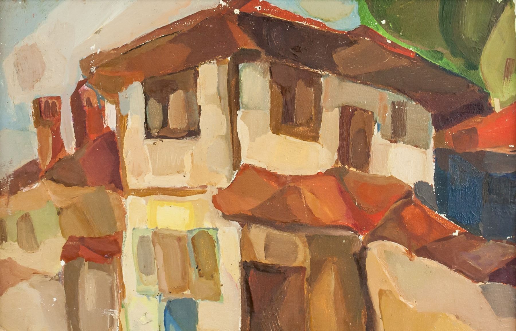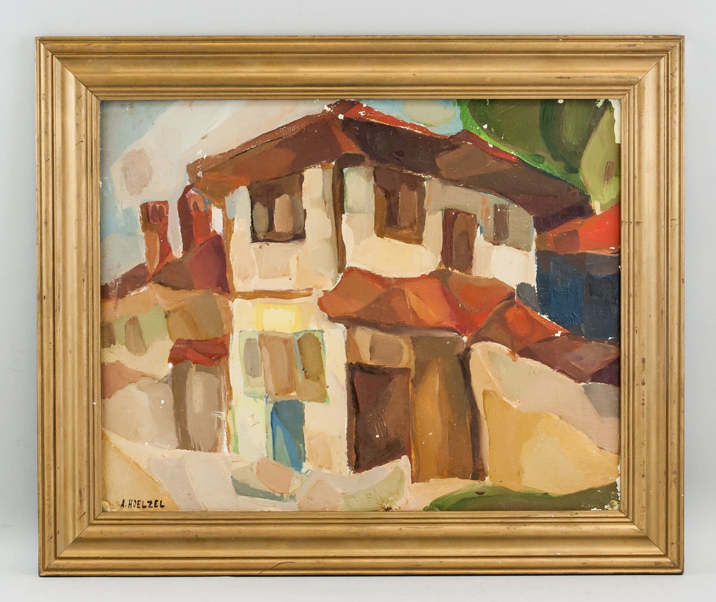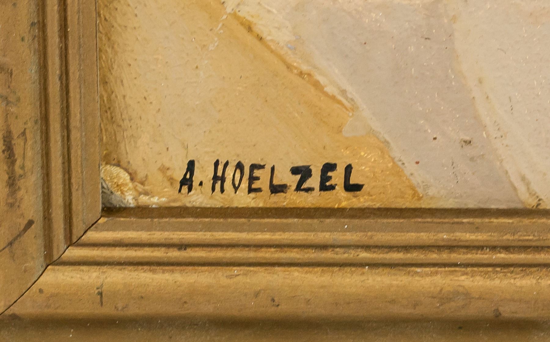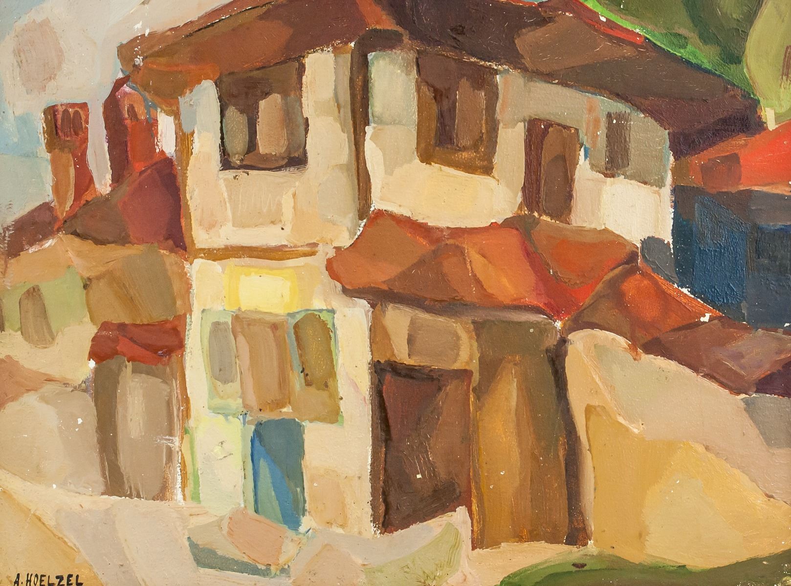 Oil on board, framed. Featuring a landscape scene of houses. Signed A HOELZEL on the lower left corner. Attributed to Adolf Holzel (1853-1934, German). 39.5 x 49.5 cm (15.5 x 19.5 in). Frame: 51 x 61 cm (20 x 24 in). PROVENANCE: Southern Ontario estate