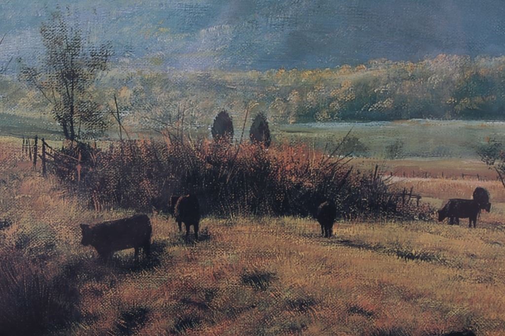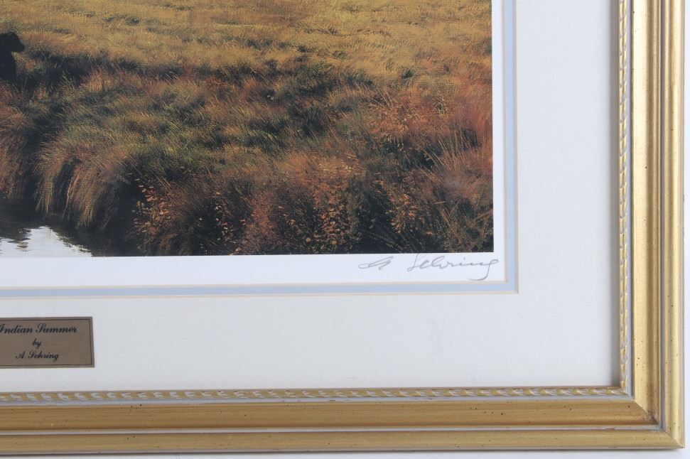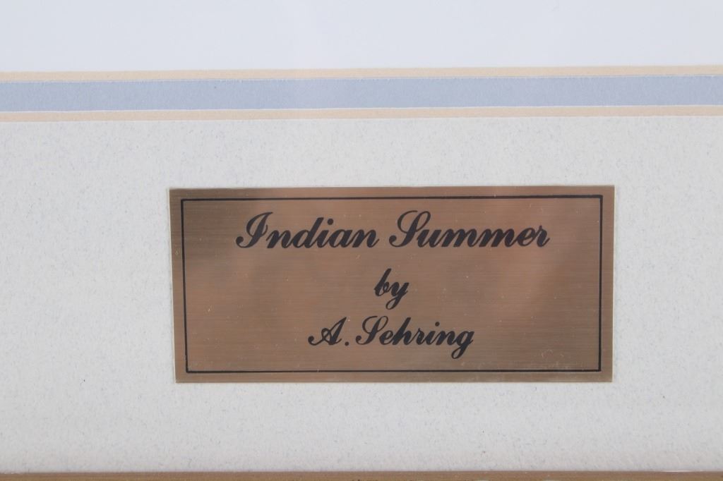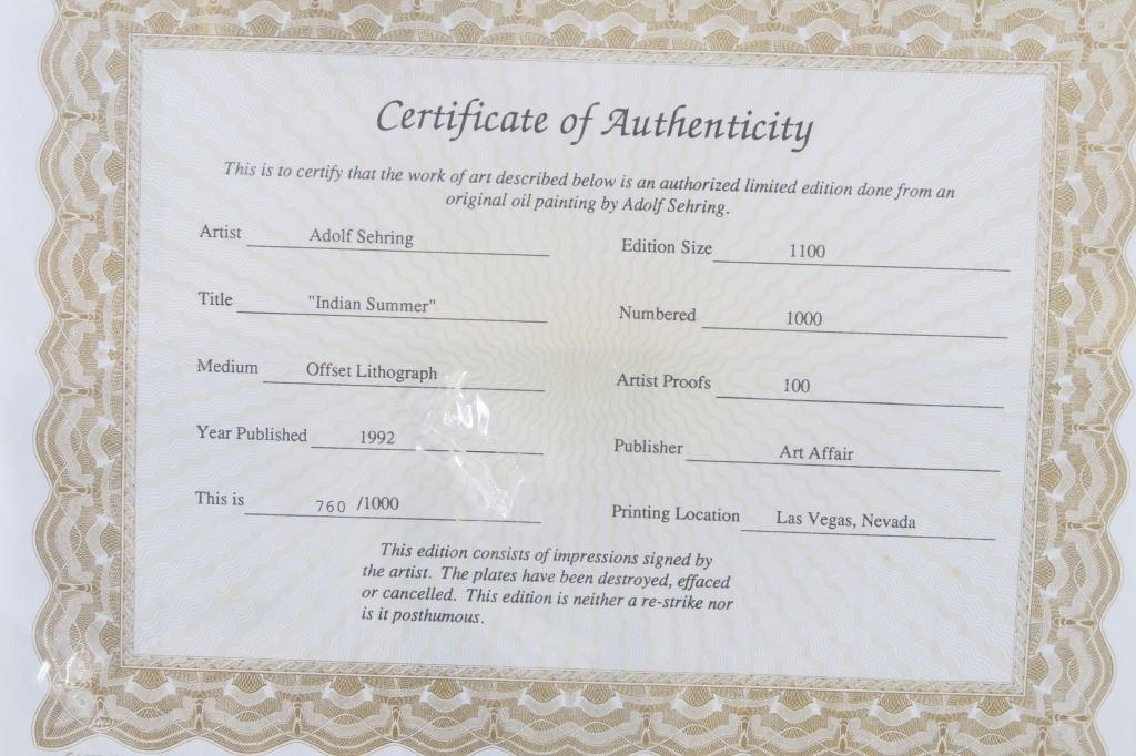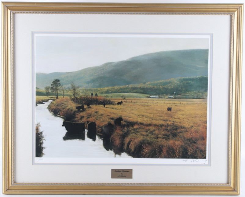 Featured in this lot is this beautiful lithograph called "Indian Summer" from Adolf Sehring (born 1930 and passed 2015). The lithograph features a beautiful scene of a pasture with the main house in the distance and cows grazing and watering in the creek through the pasture. The artist’s signature can be seen in the bottom right-hand corner of the lithograph and is numbered 760/1000. The piece features a Certificate of Authenticity in an envelope in the back. Born in Russia, Sehring's family emigrated to the United States in 1949 and settled in Philadelphia, PA. In 1951, he was sent to Korea for combat, but was transferred to Combat Intelligence to draw maps and strategic overlays. During this time, he honed his artistic skills, drawing and painting pin-ups to boost troop morale, in addition to documenting war scenes and figures. Upon returning to the US, he finally settled in Virginia, fully committing himself to the Fine Arts. His realistic paintings are powerful in their technique and details. The condition of this framed lithograph is good, with no obvious signs of damage to the artwork or the frame. The measurements of this framed lithograph are 24 1/2" x 30 1/2" and the visible art measures 16 1/2" x 22 1/4".