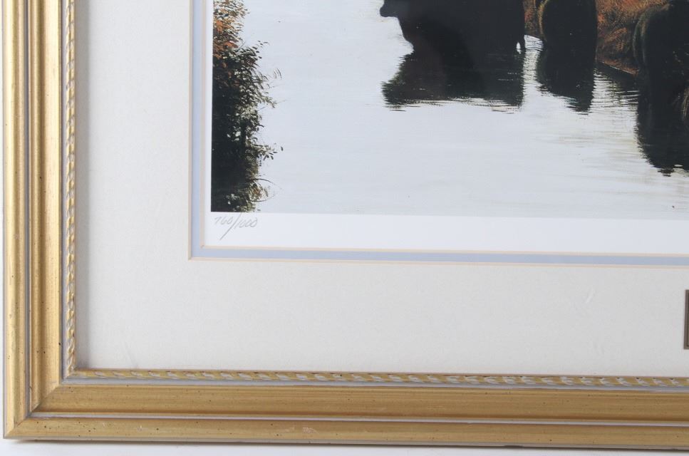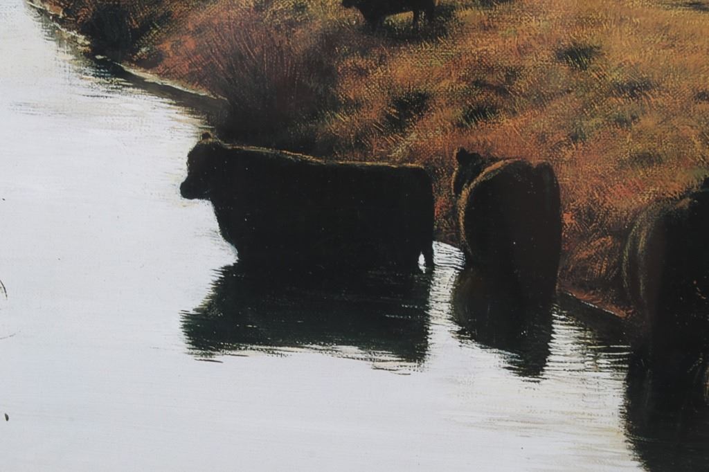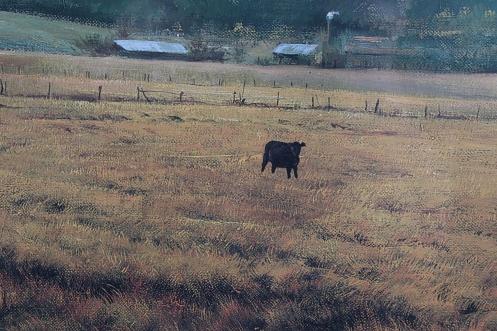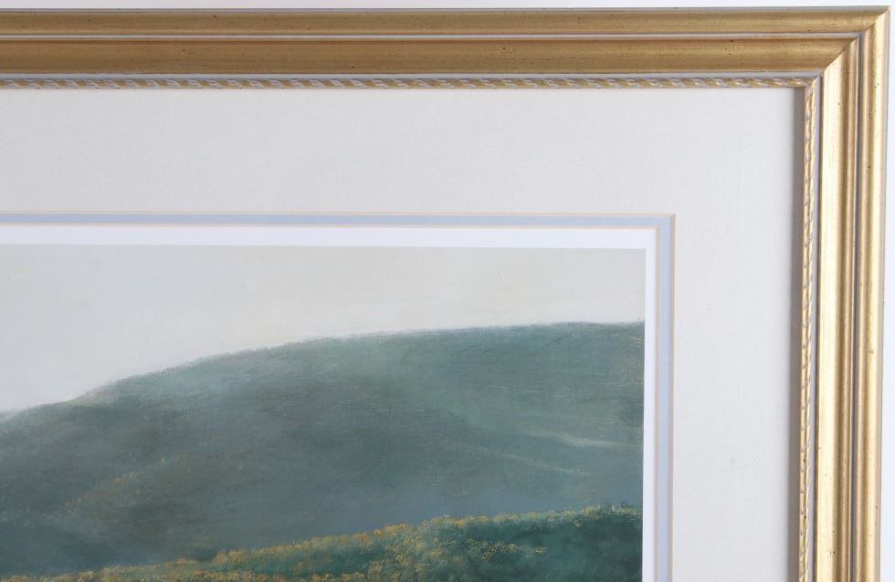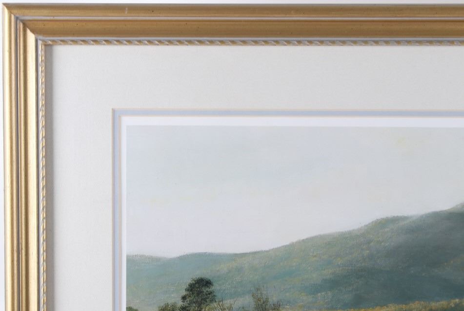 Featured in this lot is this beautiful lithograph called "Indian Summer" from Adolf Sehring (born 1930 and passed 2015). The lithograph features a beautiful scene of a pasture with the main house in the distance and cows grazing and watering in the creek through the pasture. The artist’s signature can be seen in the bottom right-hand corner of the lithograph and is numbered 760/1000. The piece features a Certificate of Authenticity in an envelope in the back. Born in Russia, Sehring's family emigrated to the United States in 1949 and settled in Philadelphia, PA. In 1951, he was sent to Korea for combat, but was transferred to Combat Intelligence to draw maps and strategic overlays. During this time, he honed his artistic skills, drawing and painting pin-ups to boost troop morale, in addition to documenting war scenes and figures. Upon returning to the US, he finally settled in Virginia, fully committing himself to the Fine Arts. His realistic paintings are powerful in their technique and details. The condition of this framed lithograph is good, with no obvious signs of damage to the artwork or the frame. The measurements of this framed lithograph are 24 1/2" x 30 1/2" and the visible art measures 16 1/2" x 22 1/4".
