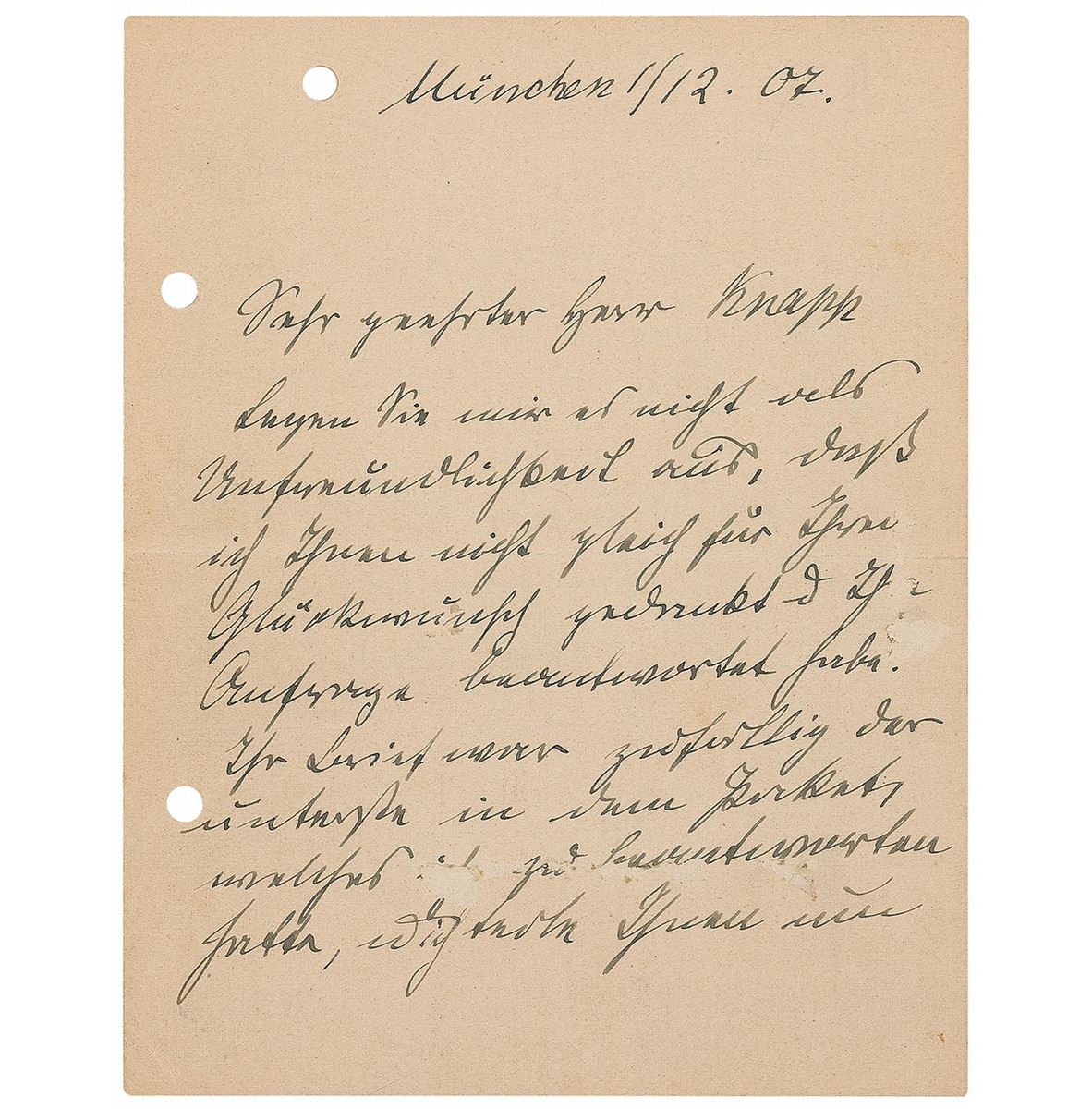German chemist (1835–1917) who synthesized indigo and was the 1905 recipient of the Nobel Prize in Chemistry. ALS in German, signed “Adolf Baeyer,” one page both sides, 5.25 x 6.75, December 1, 1907. Untranslated letter to pharmacist Alfred Knapp, apologizing for not responding to his letter earlier. Affixed to a slightly larger sheet. Punch holes to left side, a few areas of surface loss (affecting portions of the writing), trivial creasing, and a partial separation to expected mailing fold, otherwise fine condition.