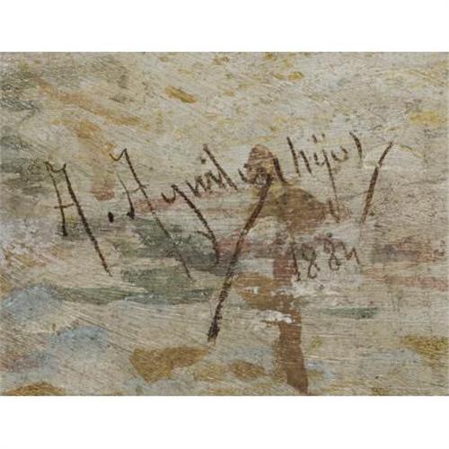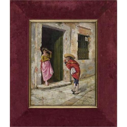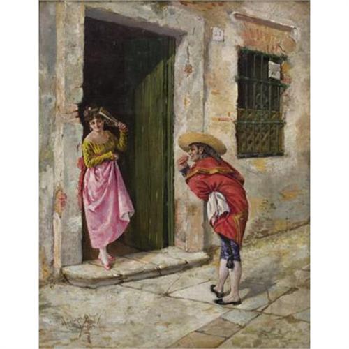<B>ADOLFO DE AGUILA (Spanish, Late 19th/Early 20th Century)</B></I><BR><I>Charming the Lady</B></I><BR>Oil on canvas<BR>16 x 12-1/2 inches (40.6 x 31.8 cm)<BR>Signed lower left: <I>A.Aguila hijo/1884</B></I><BR> <B>Condition Report:</B> Wax relining.<BR><BR><b>Shipping:</b> Framed - without Glass, Medium (<a target="_blank" href="http://www.heritageauctions.com/common/shipping.php">view shipping information</a>)