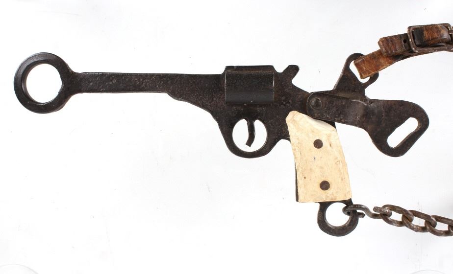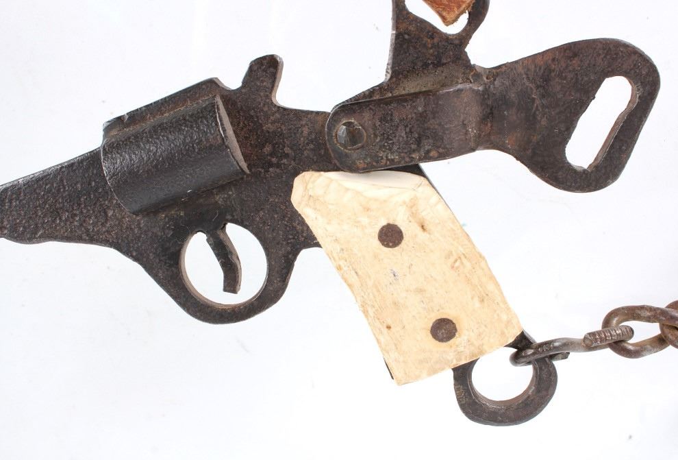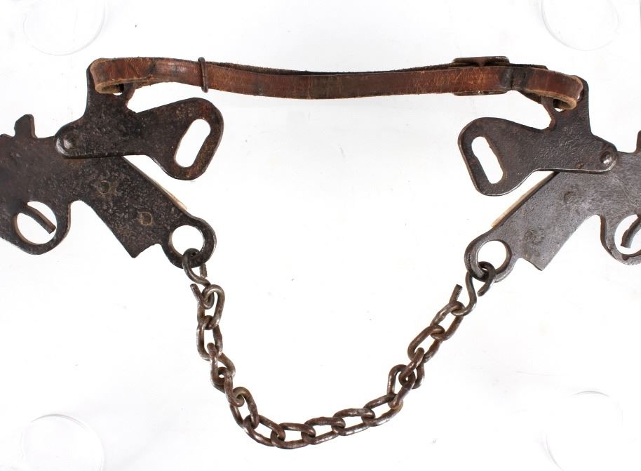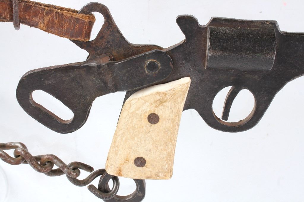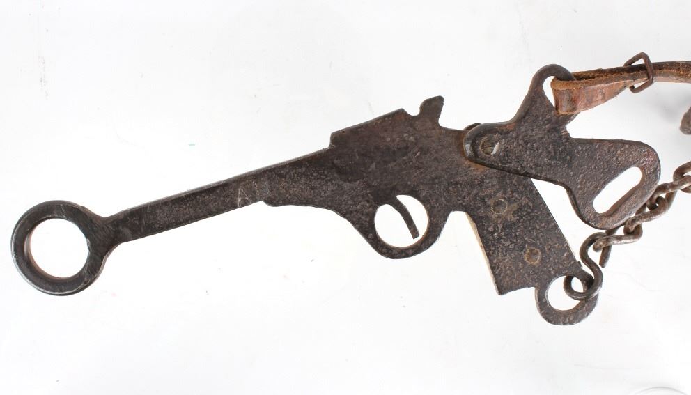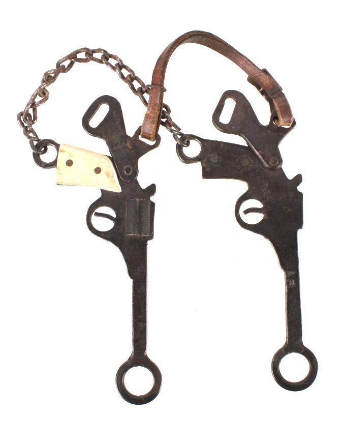 For your consideration is this Adolph Biancani bone and steel pistol hackamore circa 1885-1963. This old hackamore is marked with Adolph Biancani hallmark of "AB." Biancani was an Italian immigrant who came to the US in 1898 at age 13. He eventually moved to Elko and became a US citizen. He worked in G.S. Garcia’s shop and only 1 known example exists of a bit which features the Garcia marks as well as an “AB” stamp. His later work when he ran his own business would feature an “AB” mark inside the cheek of a bit. The condition of this hackamore is good with no obvious signs of damage and shows its age with oxidation adorning the pistols. The measurements of this hackamore are 11" x 8 1/2".