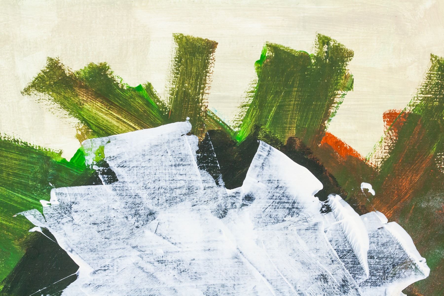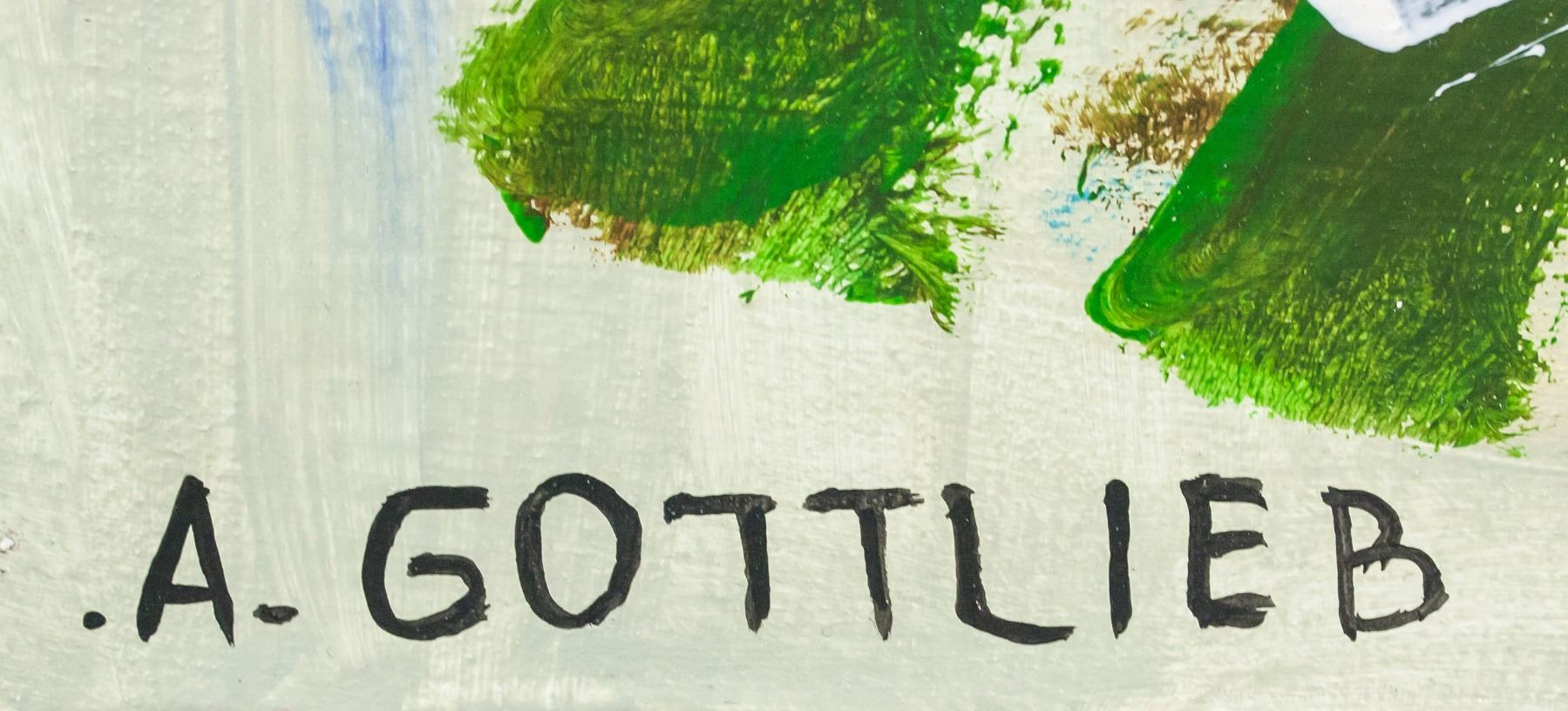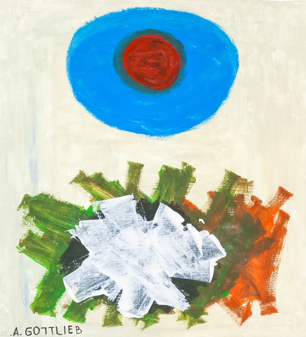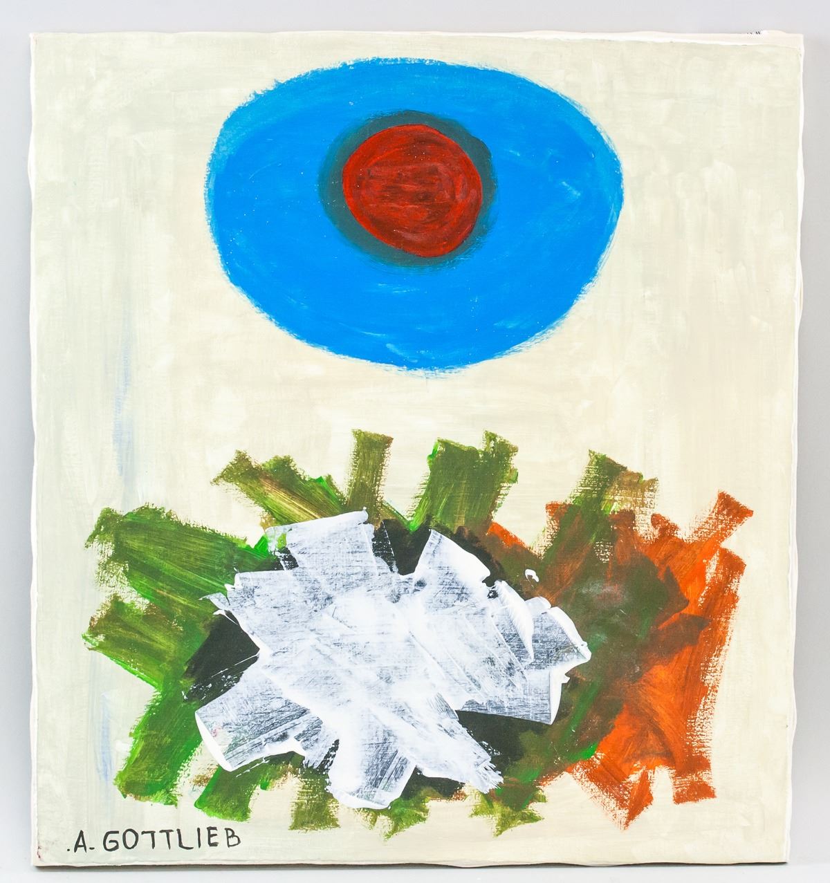 Oil on canvas. Featuring a blue circle with a red center above rectangle of overlapping white, green, and orange. Signed "A. GOTTLIEB" in the bottom left corner. Attributed to Adolph Gottlieb (1903-1974, American). 44.5 x 41 cm (17.5 x 16 in). Provenance: This lot carries limited provenance from a Southern Ontario estate