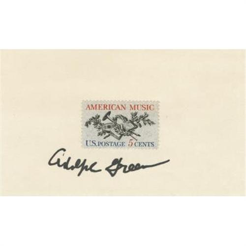 <B>Adolph Green Autograph.</B></I> A 3" x 5" card, with a five-cent commemorative postage stamp affixed, signed by Oscar-nominated lyricist and writer in black ink. Green's signature extends across the base of the card. In Excellent condition.<BR><BR><b>Shipping:</b> Flat Material, Small (<a target="_blank" href="http://www.heritageauctions.com/common/shipping.php">view shipping information</a>)