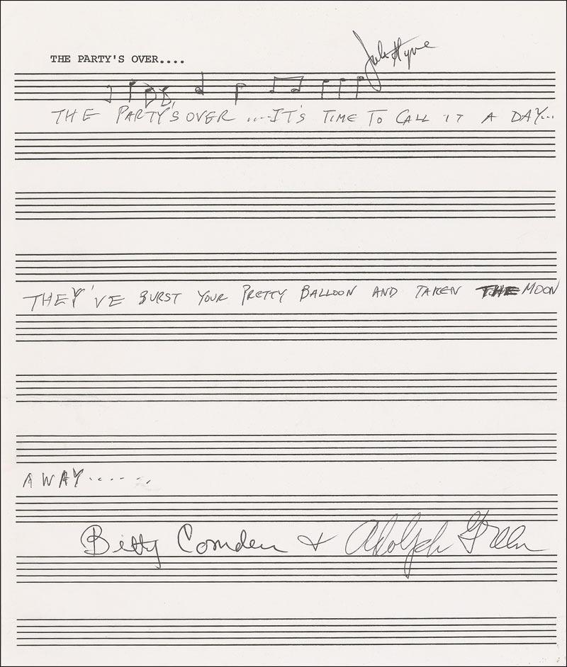 AMQS on an off-white 8.5 x 11 musically-lined sheet. Betty Comden writes a few notes and lyrics to ‘The Party’s Over,’ signed at the bottom by Betty Comden and Adolph Green. In fine condition.