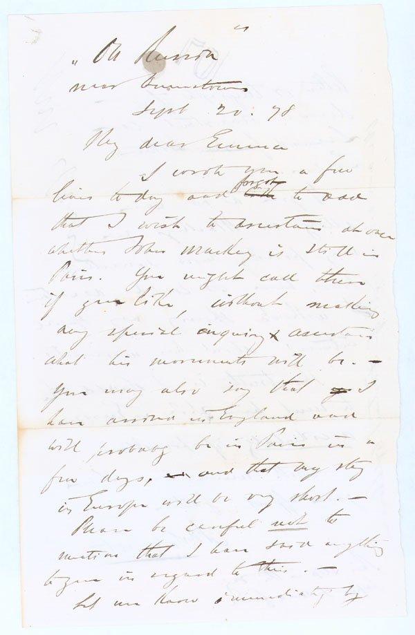 ADOLPH SUTRO (1830-1898). Mayor of San Francisco, Mining engineer. Sutro formed the Sutro Tunnel Company which constructed a tunnel to provide ventilation, drainage and an easy means of transporting men and materials to and from the mines in the region of the Comstock Lode. Two page Autograph Letter Signed to his daughter Emma: “On Russia,” is how he begins, after having just visited there on his way to England: “Sept 20, 78, My Dear Emma, I wrote you a few lines today and forgot to say that I wish to ascertain whether…Mackey is still in Paris. You might call then if you like, without making any special inquiry & ascertain what his movements will be – You may also say that I have arrived in England and will probably be in Paris in a few days…please be careful not to mention that I have said anything to you in regard to this…let me know immediately by letter of telegraph if you deem it important care Lesard brother, London…the truth is I should like to meet his Wish in Europe accidentally if possible…your affect. father, Adolph Sutro.” Across the side he writes: “We are now in sight of Fasteard(?) Lighthouse.” The name he refers to was probably John W. Mackay, who was a Nevada miner turned wealthy capitalist with his fortune being found in the Comstock Lode. An interesting reference by Sutro. 5” x 8” with a small drop stain on the word “Russia.” O/w Fine. Sutro is quite rare in letter form.