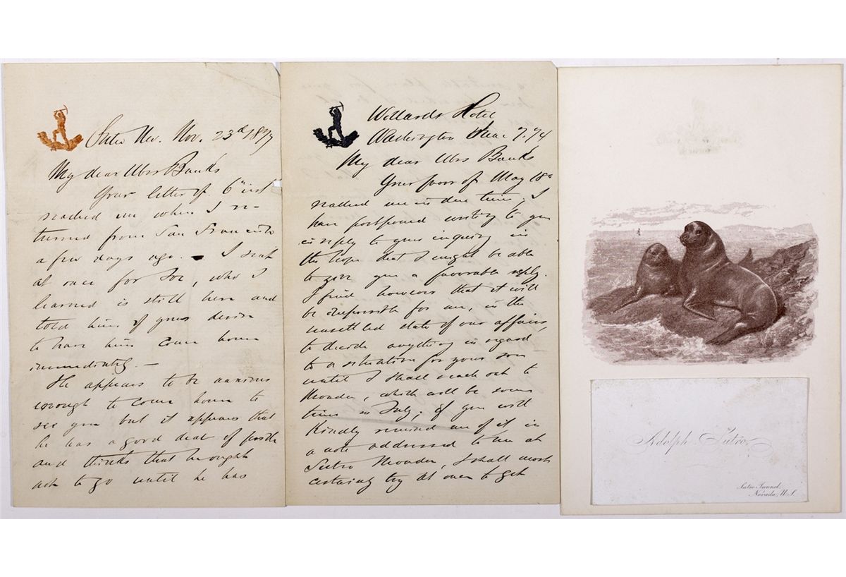 Lot of 4 items related to Comstock giant Adolph Sutro. 1) A business card, with an address of Sutro Tunnel, Nevada printed on the piece. 2) A blank Sutro note card with logo on reverse and illustration of two California Sea Lions on obverse. 3) Letter on Sutro stationary, addressed from the Willard Hotel in Washington D.C. to Massachusetts Senator Nathaniel Banks, dated 7 [illegible] 1874. Banks was a former Civil War general and was instrumental in the purchase of Alaska, while senator, a former governor of Massachusetts and was designated by President Lincoln to help with the Reconstruction plan in Louisiana. It is very sharp, with little or no fade, with some fold creasing evident. 4) Another letter from Sutro to Banks, dated 23 November 1877, which is evidence that Sutro and Banks had a long friendship. Condition is very good, save for some fold creases and small tears. - Maish Collection -58984