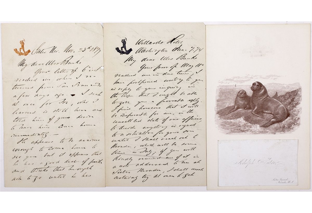 c1874 Lot of 4 items related to Comstock giant Adolph Sutro. 1) A business card, with an address of Sutro Tunnel, Nevada printed on the piece. 2) A blank Sutro note card with logo on reverse and illustration of two California Sea Lions on obverse. 3) Letter on Sutro stationary, addressed from the Willard Hotel in Washington D.C. to Massachusetts Senator Nathaniel Banks, dated 7 [illegible] 1874. Banks was a former Civil War general and was instrumental in the purchase of Alaska, while senator, a former governor of Massachusetts and was designated by President Lincoln to help with the Reconstruction plan in Louisiana. It is very sharp, with little or no fade, with some fold creasing evident. 4) Another letter from Sutro to Banks, dated 23 November 1877, which is evidence that Sutro and Banks had a long friendship. Condition is very good, save for some fold creases and small tears. - HKA#66053