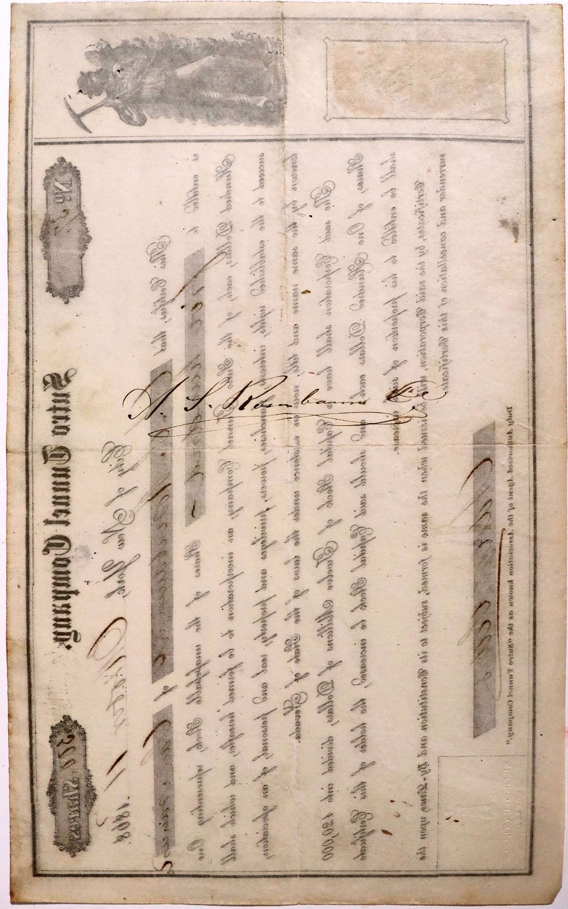 Sutro Tunnel Company Stock Certificate Signed by Adolph Sutro, 1868. Choice first issue stock certificate with an uncancelled Sutro autograph. Dateline New York, Oct. 11, 1868. No. 37, issued for 500 shares to A. Rosenbaum of San Francisco. Signed by Adolph Sutro as Duly Authorized Agent of the Association known as the ìSutro Tunnel Company. Not cancelled. Black border and print with vignette in upper left of Sutro with a pick. 25 cent US IR bond adhesive revenue stamp at lower left, pen cancelled. No printer listed. 6.5 x 11 Sutro first came up with the idea of the tunnel in 1860, got federal and state approval in 1865, and construction began in 1869. He envisioned the tunnel as taking care of the water problem that Comstock mining operations were encountering at depth. As Sutro said in his proposal, "the great obstacle to be encountered in mines is water; this is the fatal agent, which makes it only a question of time, when a mine will have to be abandoned, no matter how rich..." However, he also had plans to capitalize on the project by transporting ore to his mills and furnish his workers with homes in the planned Sutro townsite. He also charged the Comstock mines royalties on ore transported through the tunnel. William Sharon (and the Bank of California) realized how deadly Sutros project could be for their own milling ventures and tried to stop it. But Sutro persisted, and even used the 1869 Yellow Jacket fire as a cause to rally behind his tunnel. He got his funding, and the tunnel was completed in 1878 by connecting to the Savage Mine. But since the mining had proceeded to levels below the tunnels 1,640 ft. depth, the tunnel was too late to be of critical importance to the Comstock. Sutro sold his shares and moved to San Francisco, where he eventually became mayor. Sutro Nevada 1868