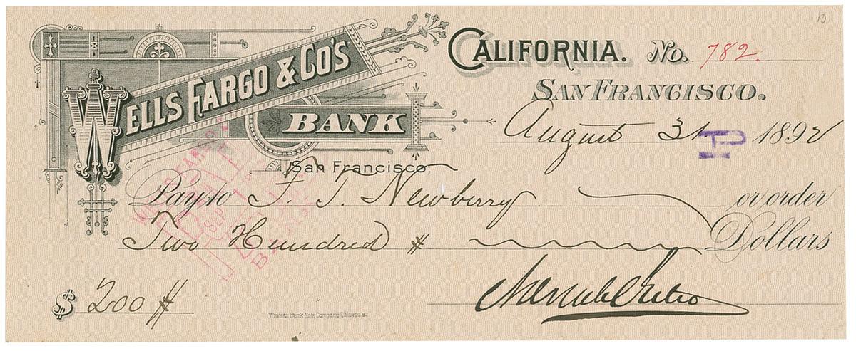 Mining engineer (1830–1898) who formed the Sutro Tunnel Company which constructed a tunnel to provide ventilation, drainage, and an easy means of transporting men and materials to and from the mines in the region of the Comstock Lode. Retiring to San Francisco in 1879, he became active in civic and business affairs, and was elected mayor in 1894. Wells Fargo & Co. bank check, 8 x 3, filled out in another hand and signed by Sutro, payable to F. T. Newbury for $200.00, August 31, 1892. Three vertical folds, one through a single letter of signature, cancellation cut to body, and expected stamps, otherwise fine condition.