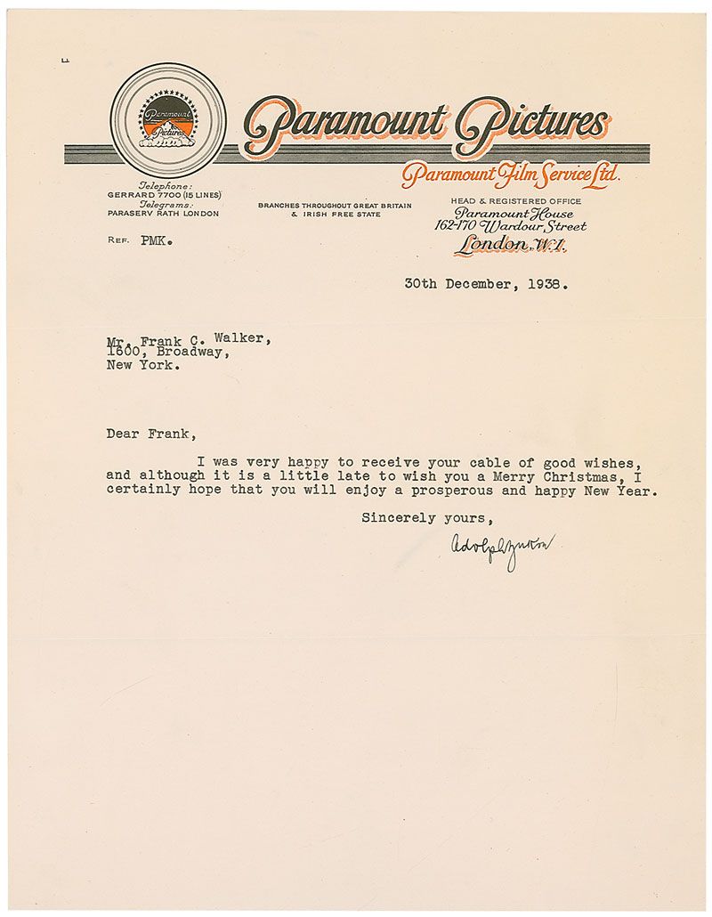 Pioneering American motion picture producer and executive (1873–1976) who was the founder and longtime head of Paramount Studios. Among the films whose production he personally oversaw were the classics Make Way for Tomorrow and Dr. Jekyll and Mr. Hyde. He received an honorary Oscar in 1948 for his contributions to the motion picture industry. TLS, one page, 8.5 x 11, Paramount Pictures, London letterhead, December 30, 1938. In full: “I was very happy to receive your cable of good wishes, and although it is a little late to wish you a Merry Christmas, I certainly hope that you will enjoy a prosperous and happy New Year.” In fine condition, a few light creases and wrinkles, and a couple of minor edge tears.