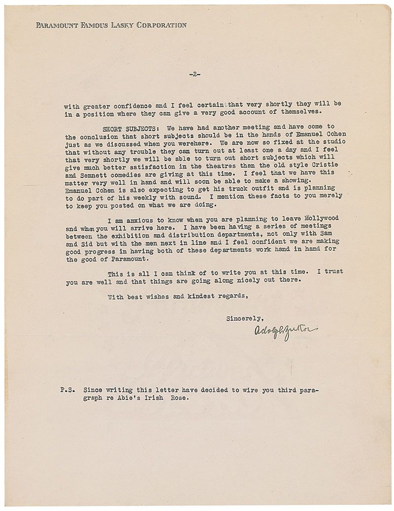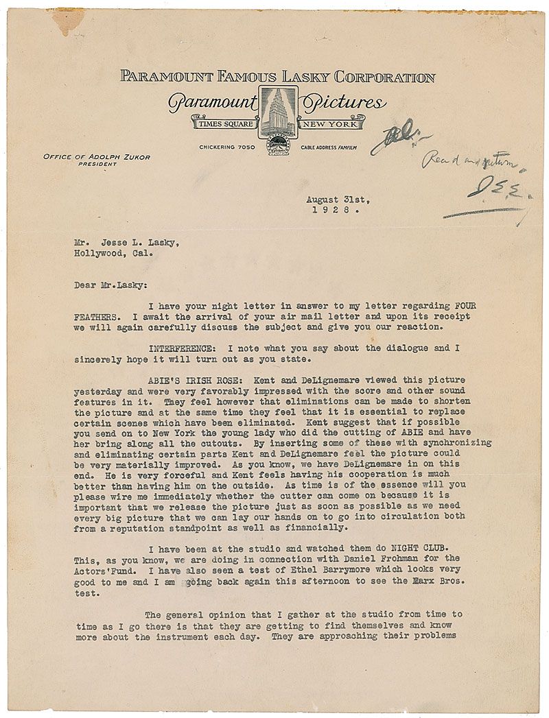 TLS, two pages, 8.5 x 11, Paramount Pictures letterhead, August 31, 1928. Letter to producer and Paramount co-founder Jesse L. Lasky. In part: “Abie’s Irish Rose: Kent and DeLignemare viewed this picture yesterday and were very favorably impressed with the score and other sound features in it…it is important that we release the picture just as soon as possible as we need every big picture that we can lay our hands on to go into circulation both from a reputation standpoint as well as financially…I have also seen a test of Ethel Barrymore which looks very good to me and I am going…to see the Marx Bros. test.” Pages are affixed to each other in the upper left corner. Light toning and soiling, and expected filing holes and office notations to the top, otherwise fine condition.