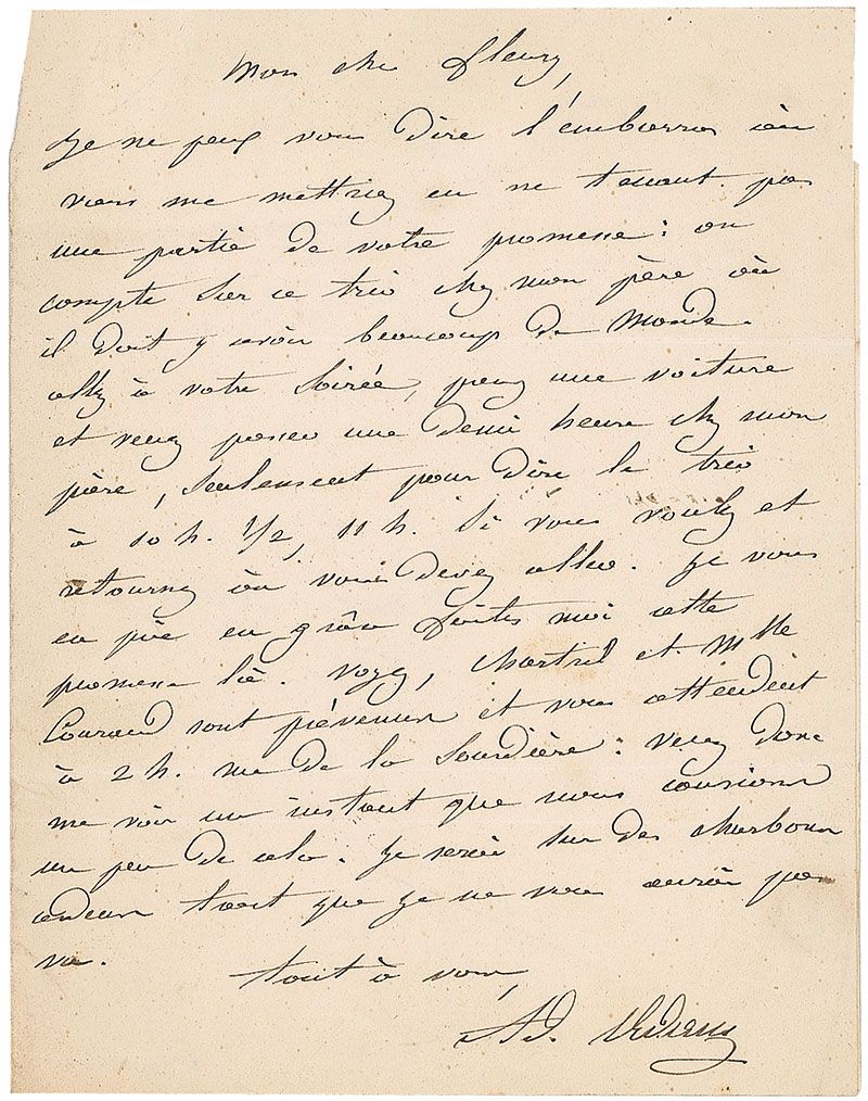 French composer (1803–1856) best-known for his famous ballet ‘Giselle.’ ALS in French, signed “Ad. Adam,” one page, 4 x 5, no date. Letter to Monsieur Fleury, an anxious request to confirm his participation in a trio, to be performed for a large audience at Adam’s father’s house. Second integral page bears a brief address panel in Adam’s hand. Some mild toning, and paper loss to top of second page, otherwise fine condition.