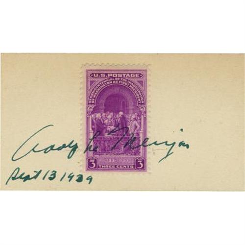 <B>Adolphe Menjou Autograph.</B></I> A 3.5" x 2" card, with a 1939 three-cent stamp affixed, autographed by Adolphe Menjou in green ink. Under his signature, Menjou dated the card September 13, 1939 (eight days after the release of his film <I>Golden Boy,</B></I> with Barbara Stanwyck). In Very Fine condition with mild age-toning and tape residue en verso (not affecting signature).<BR><BR><b>Shipping:</b> Flat Material, Small (<a target="_blank" href="http://www.heritageauctions.com/common/shipping.php">view shipping information</a>)