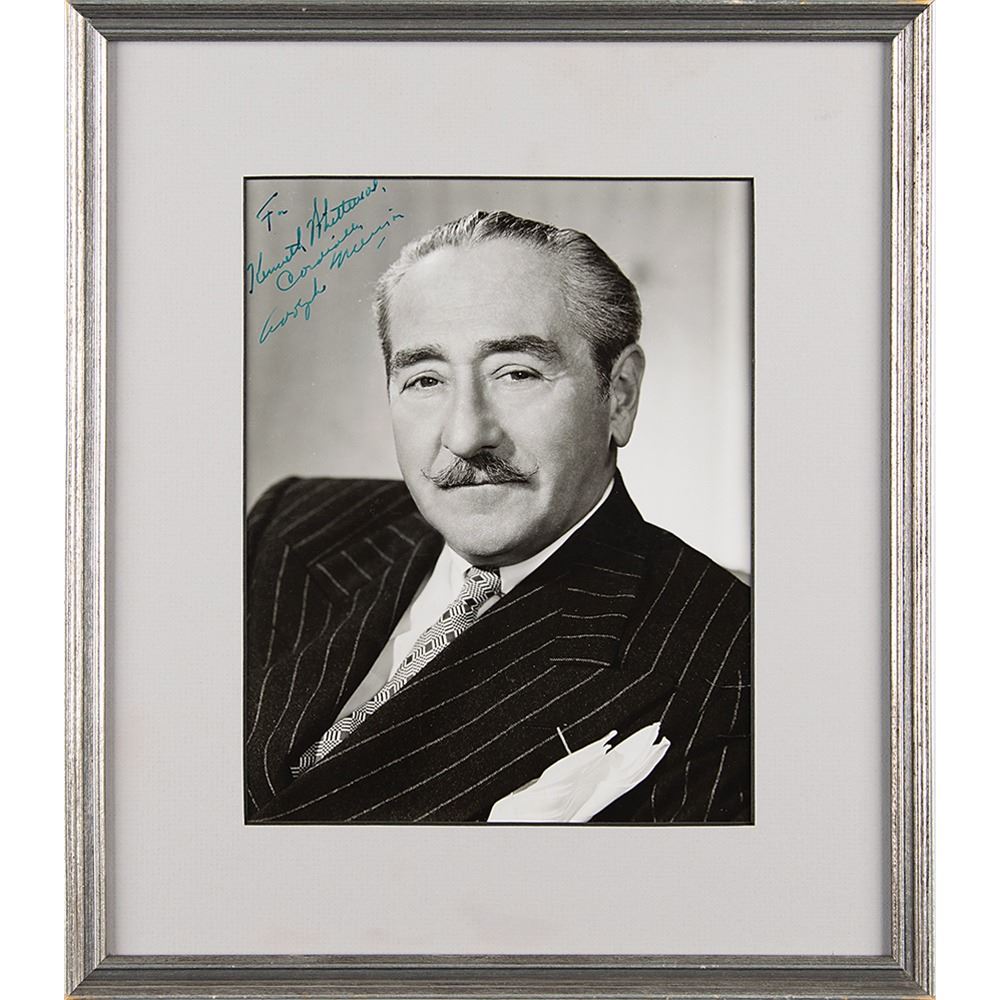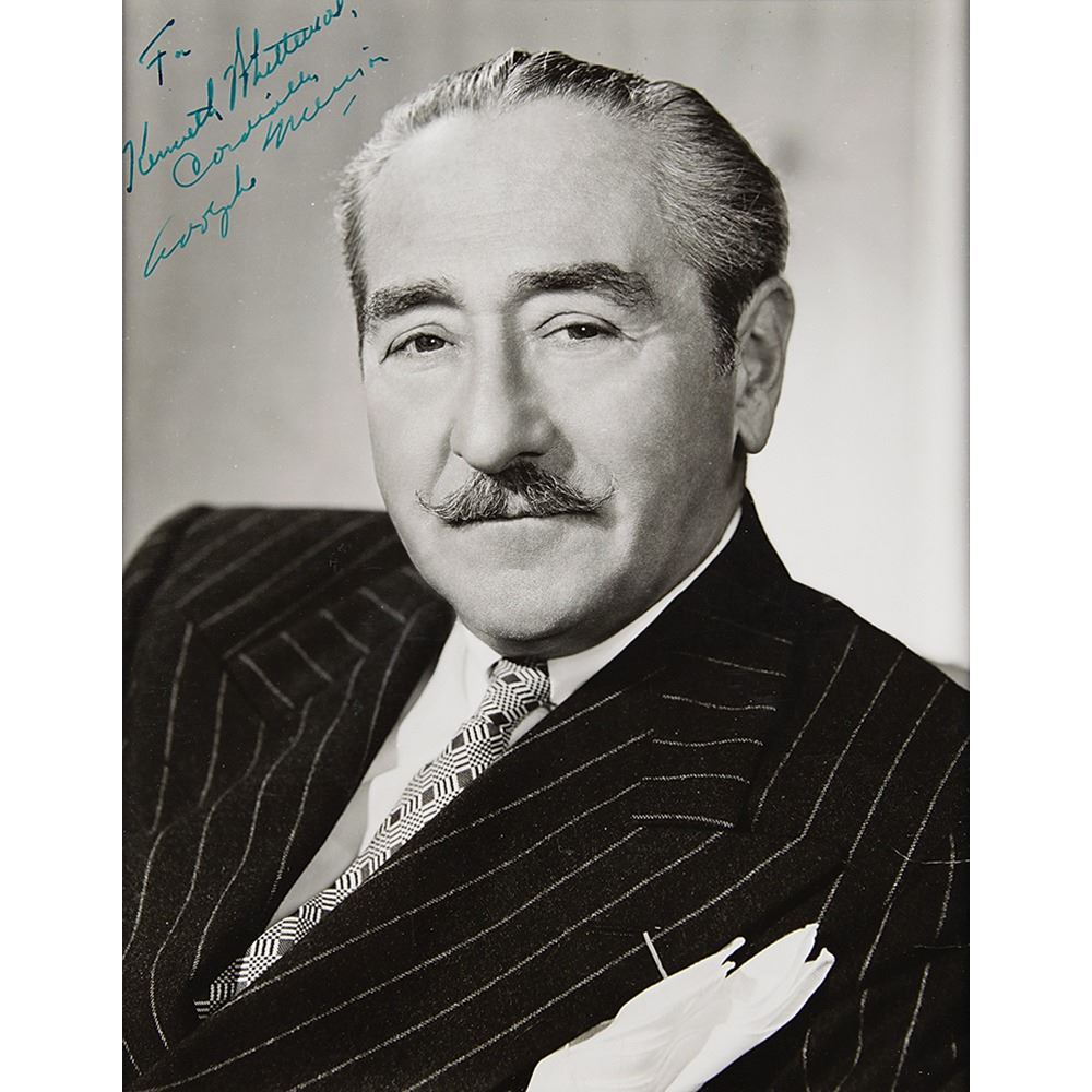 Vintage glossy 7 x 9 photo of the mustached man in a classy pinstriped suit, signed and inscribed in fountain pen, "For Kenneth Whittmore, Cordially, Adolphe Menjou.” Matted and framed to an overall size of 12 x 14. In fine condition, with scattered small creases.