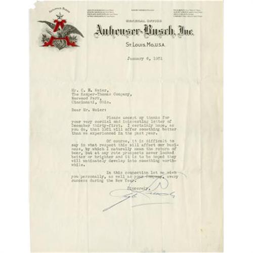 <B>Adolphus Busch III Typed Letter Signed</B></I> “<I>Adolphus Busch</B></I>”. One page, 8.25” x 11”, on Anheuser-Busch company letterhead, St. Louis, January 6, 1931, to C. H. Weier, Cincinnati. This letter, written just two years before the repeal of Prohibition, expresses hope that a change in legislation might offer hope for the brewer to resume production of beer. It reads in part: “Of course, it is difficult to say in what respect this will affect our business, in which I naturally mean the return of beer, but at any rate prospects never looked better or brighter and it is to be hoped they will ultimately develop into something worthwhile.” During Prohibition, Anheuser-Busch built truck bodies and refrigerated cabinets; manufactured barley malt syrup and ice cream; and entered the baker's yeast business. From 1920 - 1927, more than 26 new products -- including a non-alcohol version of Budweiser -- were introduced to keep the company in business. With several fold creases, a small portion of the upper left corner missing, toned around the edges, else very good. <BR><BR><b>Shipping:</b> Flat Material, Small (<a target="_blank" href="http://www.heritageauctions.com/common/shipping.php">view shipping information</a>)