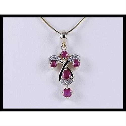 Adorable pendant with 4 round cut and 1 pear shaped ruby that weigh approximately 0.55 carats and 7 full cut diamonds set in 14K yellow gold. The pendant measures 27.3 millimeters (1.08 inches) x 12.6 millimeters (0.50 inches) and weighs 2.10 grams total weight.