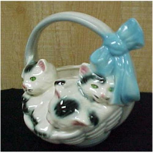 Adorable Cat/Kitten Bowl with grey handle and blue bow. Three kittens. Probably 1930's. Buyer pays shipping and handling costs.