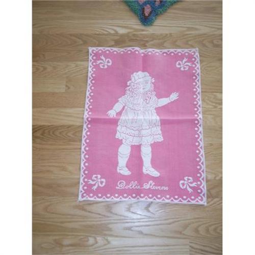 This is an adorable doll blanket with a doll on the front of it and it says DOLLY STEVENS.The pattern is the same on both sides.This would be wonderful framed also.I had a blue on like it but I think that one sold some time ago.I just un-packed this one and it is in wonderful condition.Measures 20 1/4 x 15 1/4".