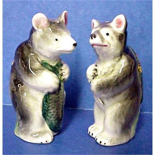 Adorable pair, Mr. and Mrs Bear coming home from fishing - On the back of each bear "Clear Lake Man.Canada". Salt and Pepper shakers.Excellent condition,US Buyer please pay 7.00 for shipping, Thank You for looking!