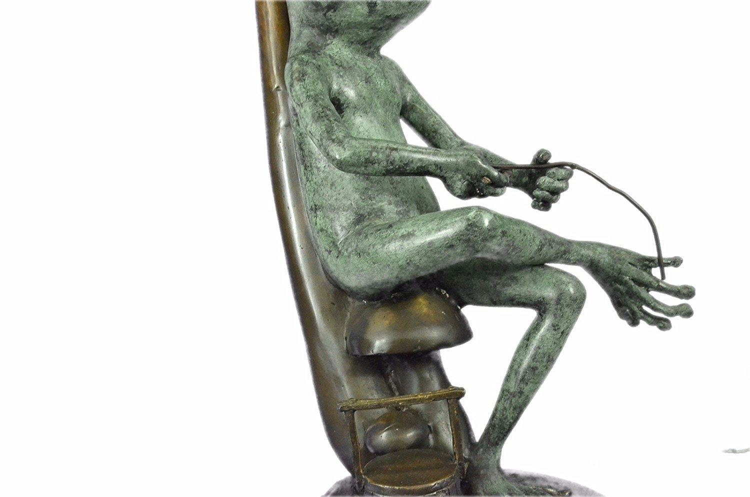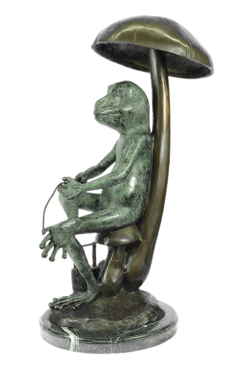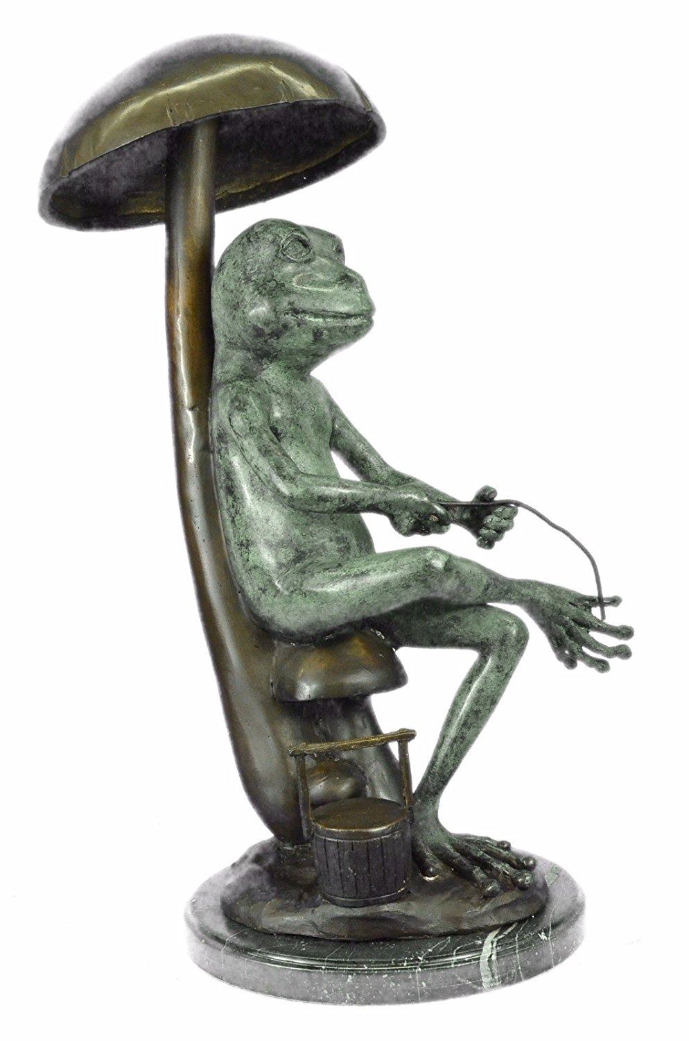 This is an adorable limited edition collector™s item of 100. It is a statue of a frog fishing and sitting underneath a large mushroom. He sits smiling, enjoying his favorite hobby and casually resting one leg over his knee. He rests upon a toadstool, a small one sprouted next to his and an even larger one providing him shelter and a back support. A bucket is at his feet, empty and ready to keep some fish in, a make shift fishing rod rests in his hands. He has a beautiful patina that resembles an antique bronze as it is a teal patchy coat that covers the entire frog. The rest of this sculpture is a two tone brown patina, lighter at the top on the largest mushroom. Cast using the ancient Lost Wax Method and made of 100% bronze. Bronze Dimensions with Marble Base: Height 23 X Width 20 inches. Weight:27 LBS. Inventory: 18-50596M11681