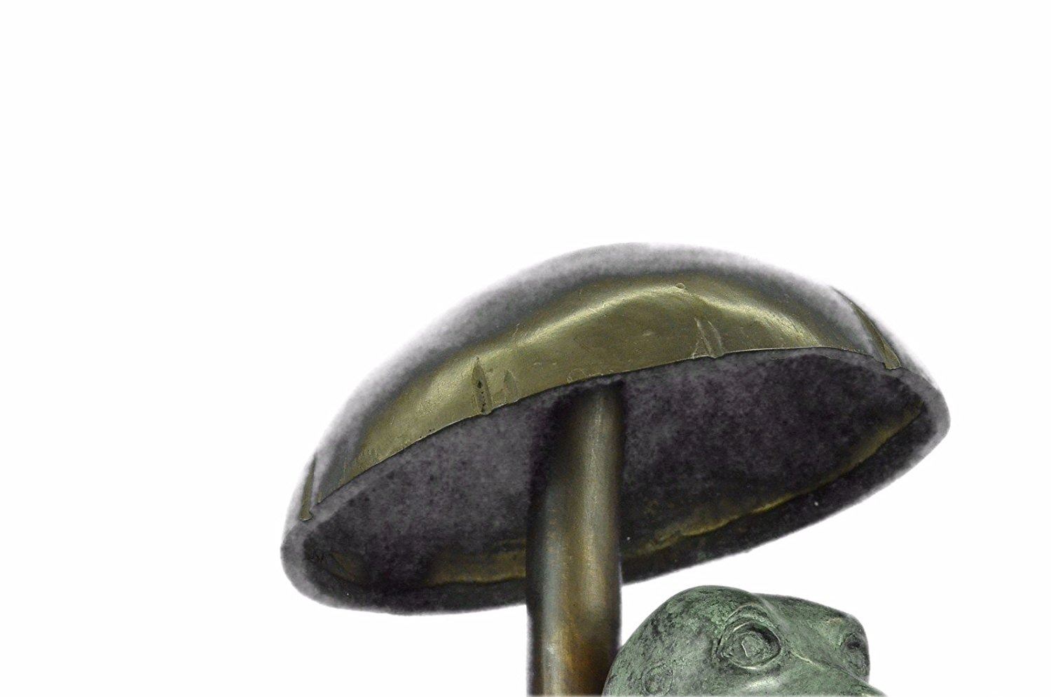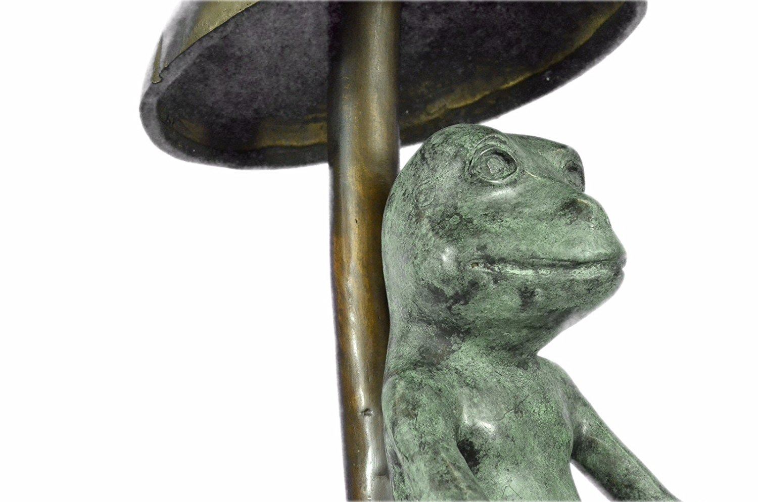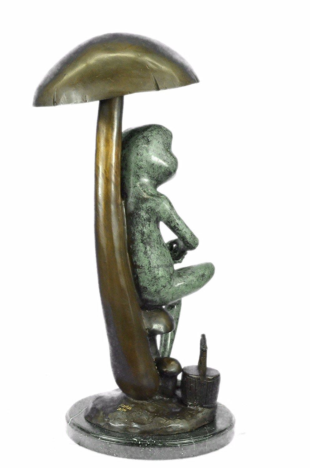 This is an adorable limited edition collector™s item of 100. It is a statue of a frog fishing and sitting underneath a large mushroom. He sits smiling, enjoying his favorite hobby and casually resting one leg over his knee. He rests upon a toadstool, a small one sprouted next to his and an even larger one providing him shelter and a back support. A bucket is at his feet, empty and ready to keep some fish in, a make shift fishing rod rests in his hands. He has a beautiful patina that resembles an antique bronze as it is a teal patchy coat that covers the entire frog. The rest of this sculpture is a two tone brown patina, lighter at the top on the largest mushroom. Cast using the ancient Lost Wax Method and made of 100% bronze. Bronze Dimensions with Marble Base: Height 23 X Width 20 inches. Weight:27 LBS. Inventory: 18-50596M11681
