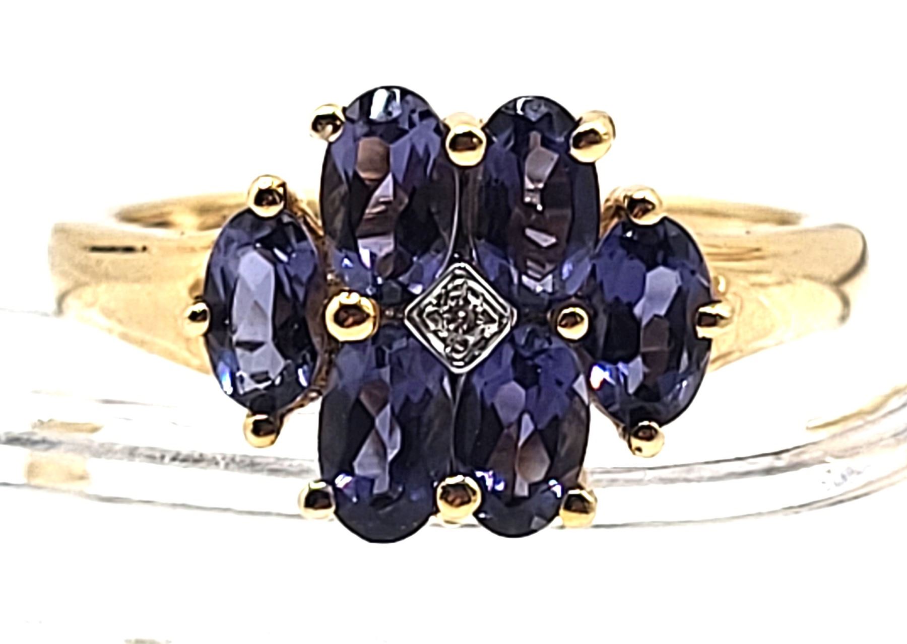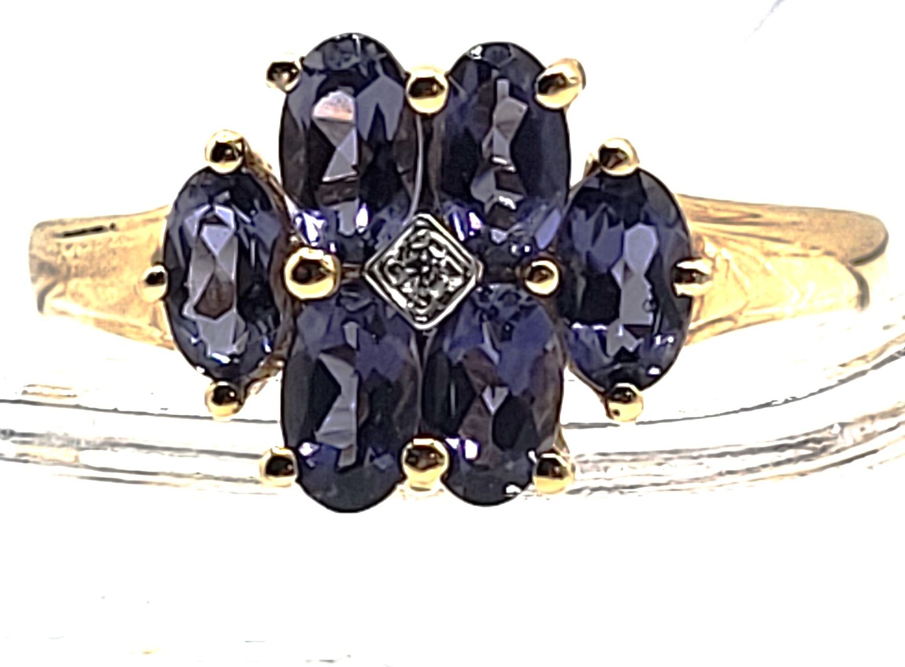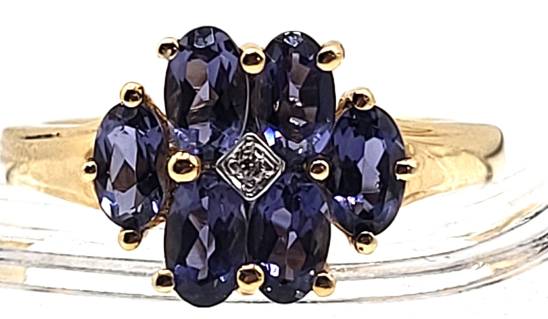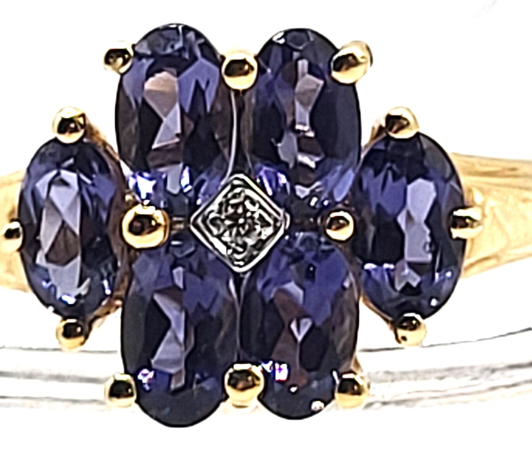 This 14 karat yellow gold ring features approximately 1.50 carats total weight of oval-cut, prong-set, genuine purple tourmalines in flower design, with a round, brilliant-cut accent diamond in the center.& nbsp; The ring is US size 7 and can be sized for an additional charge. The ring has smooth, polished cathedral shoulders that taper to an approximate 2.10 mm wide shank.& nbsp;& nbsp;