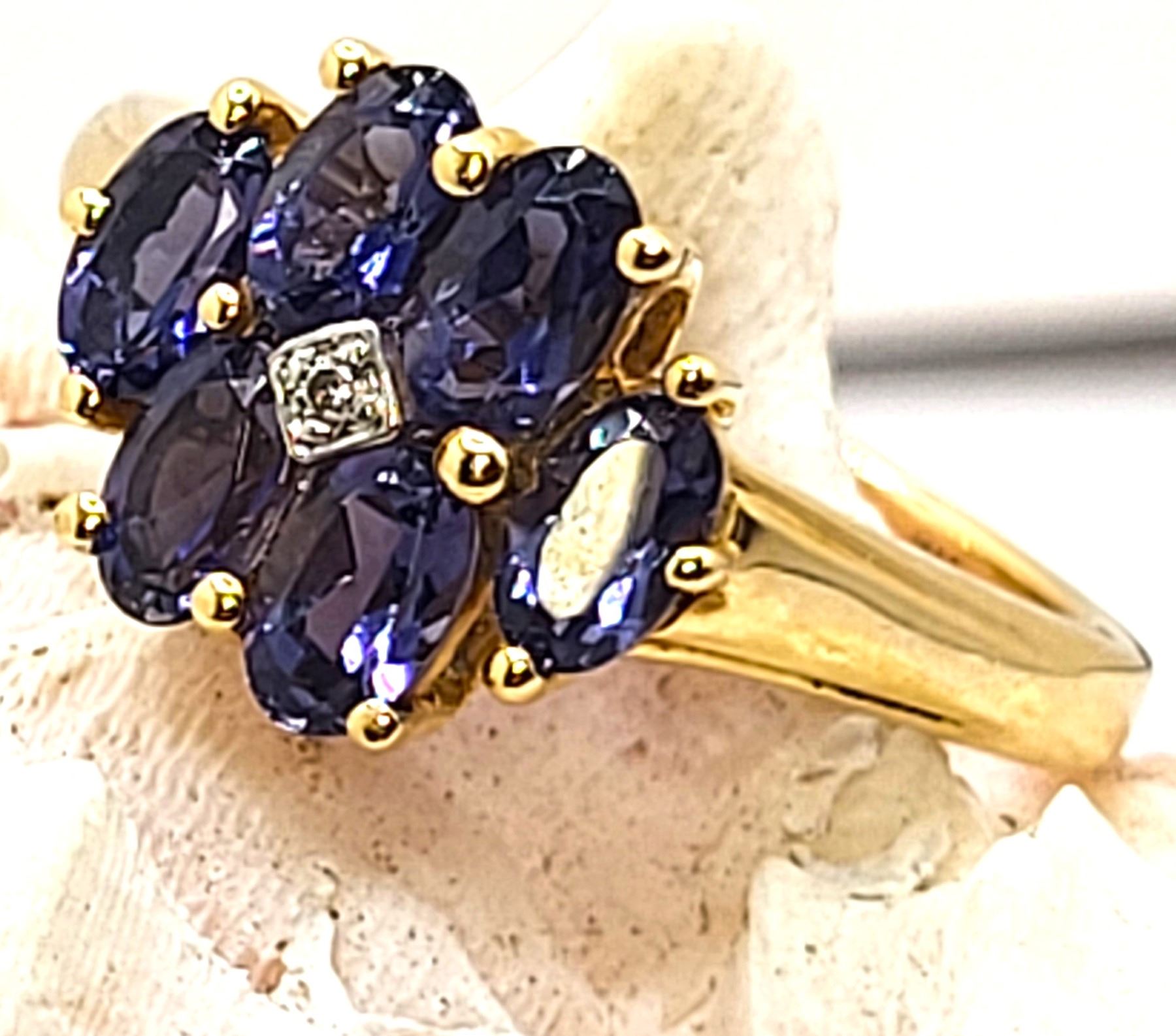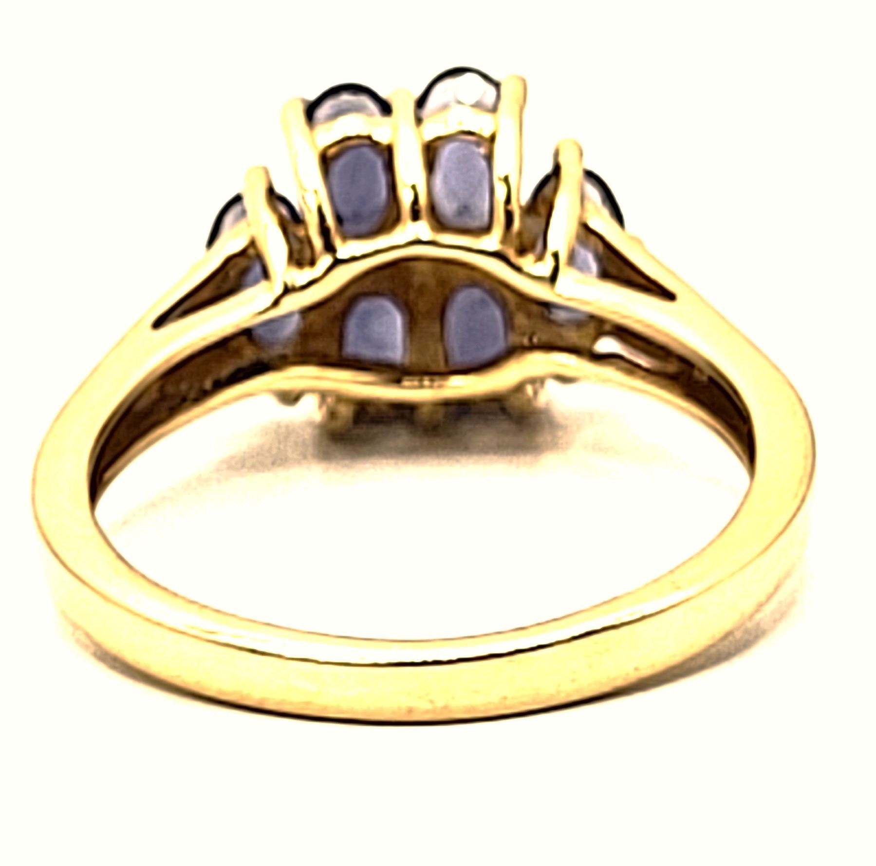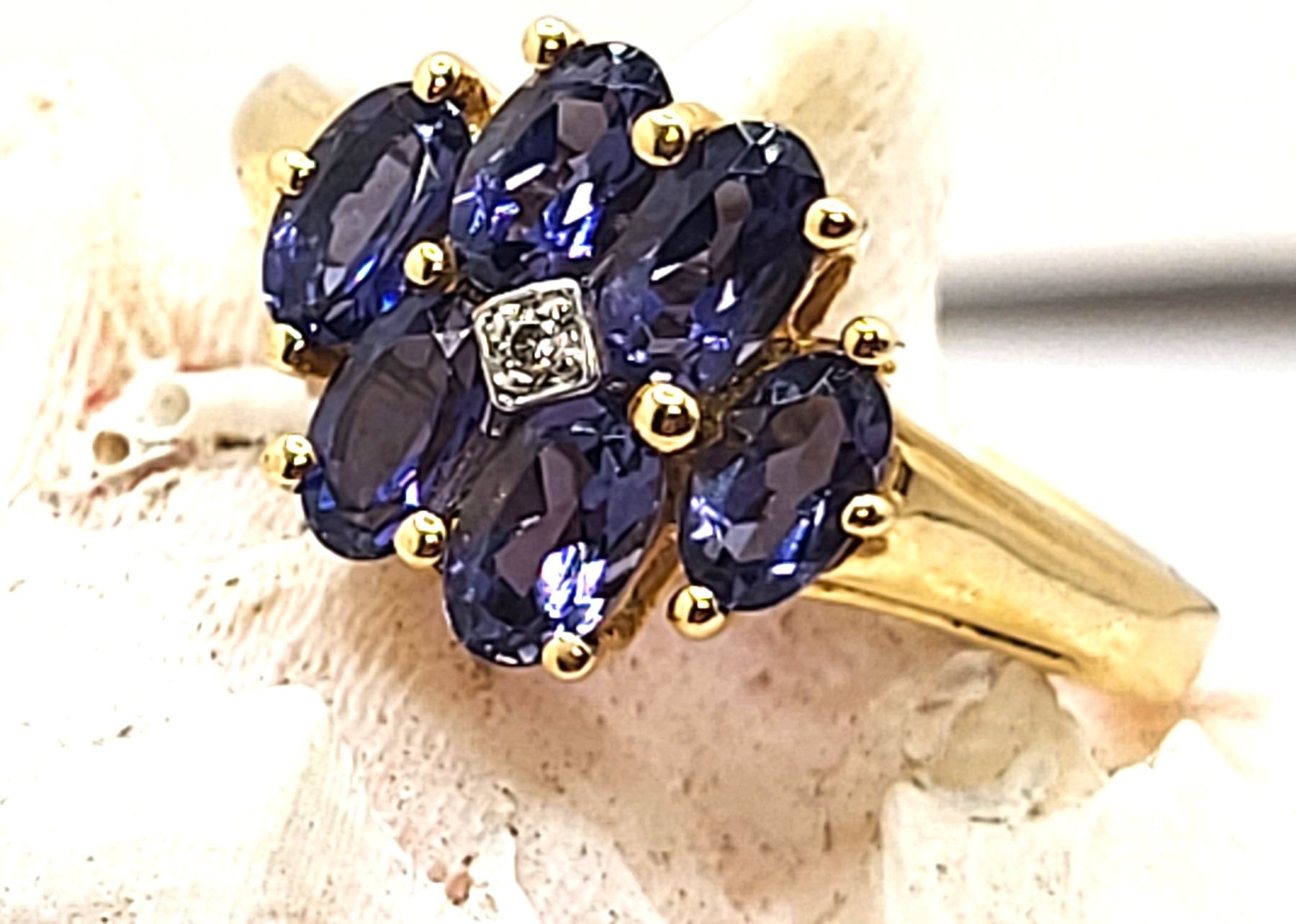 This 14 karat yellow gold ring features approximately 1.50 carats total weight of oval-cut, prong-set, genuine purple tourmalines in flower design, with a round, brilliant-cut accent diamond in the center.& nbsp; The ring is US size 7 and can be sized for an additional charge. The ring has smooth, polished cathedral shoulders that taper to an approximate 2.10 mm wide shank.& nbsp;& nbsp;