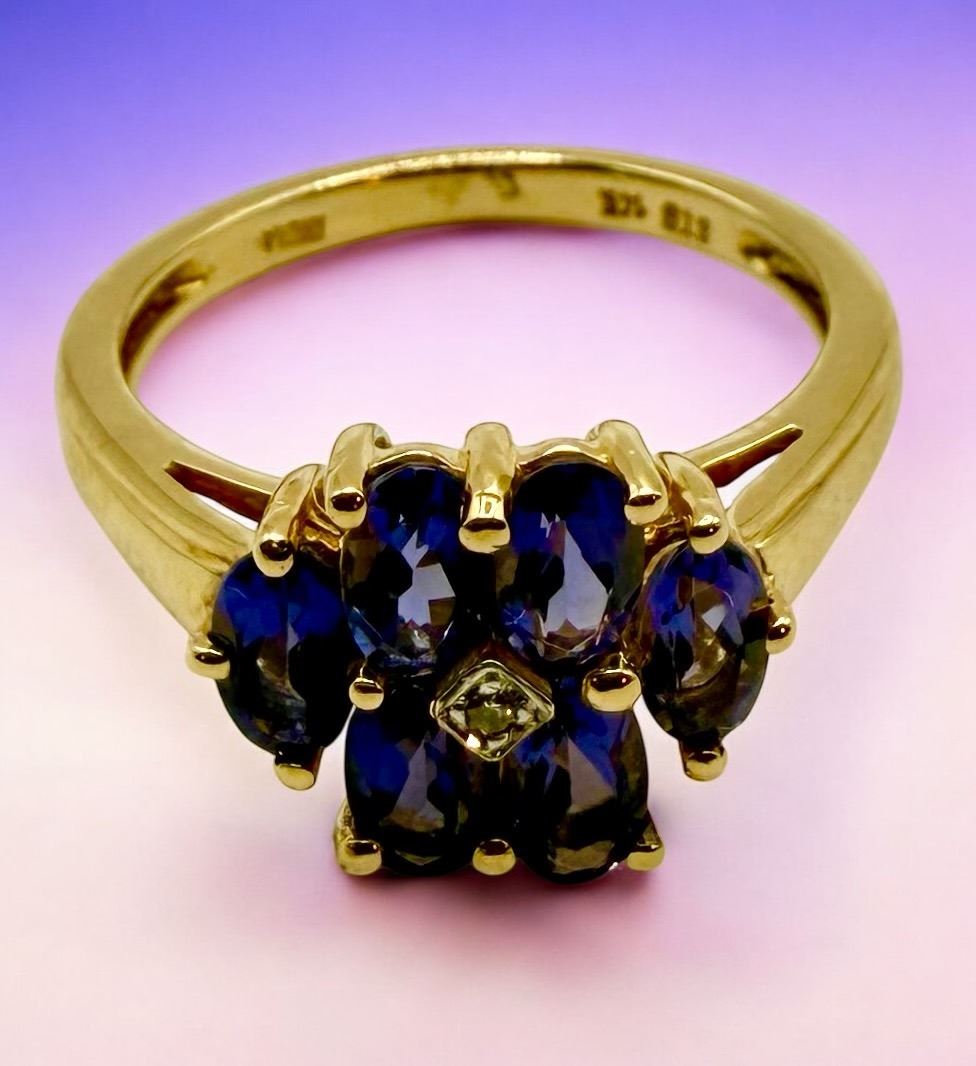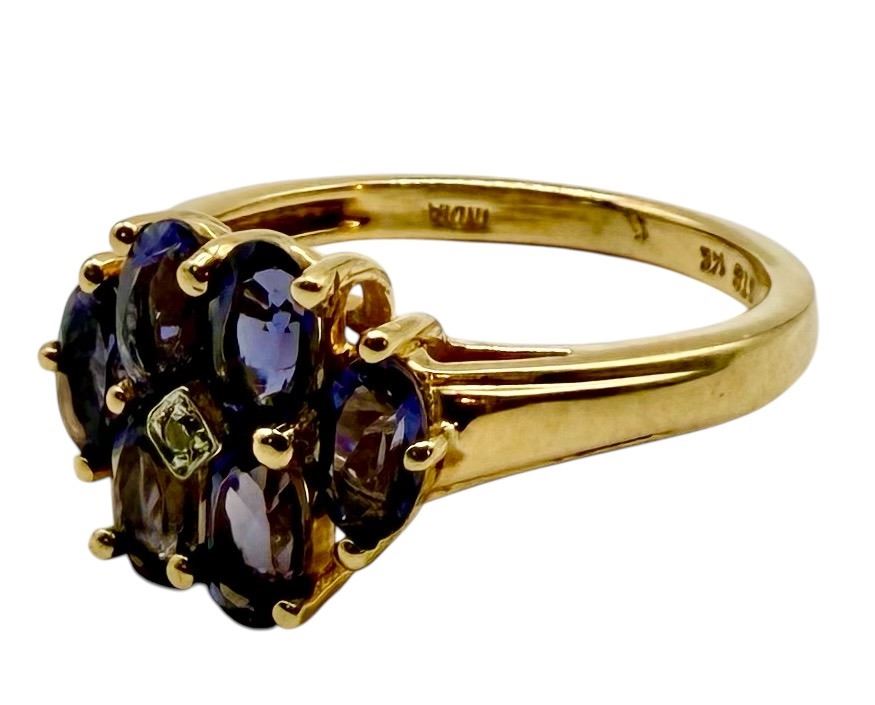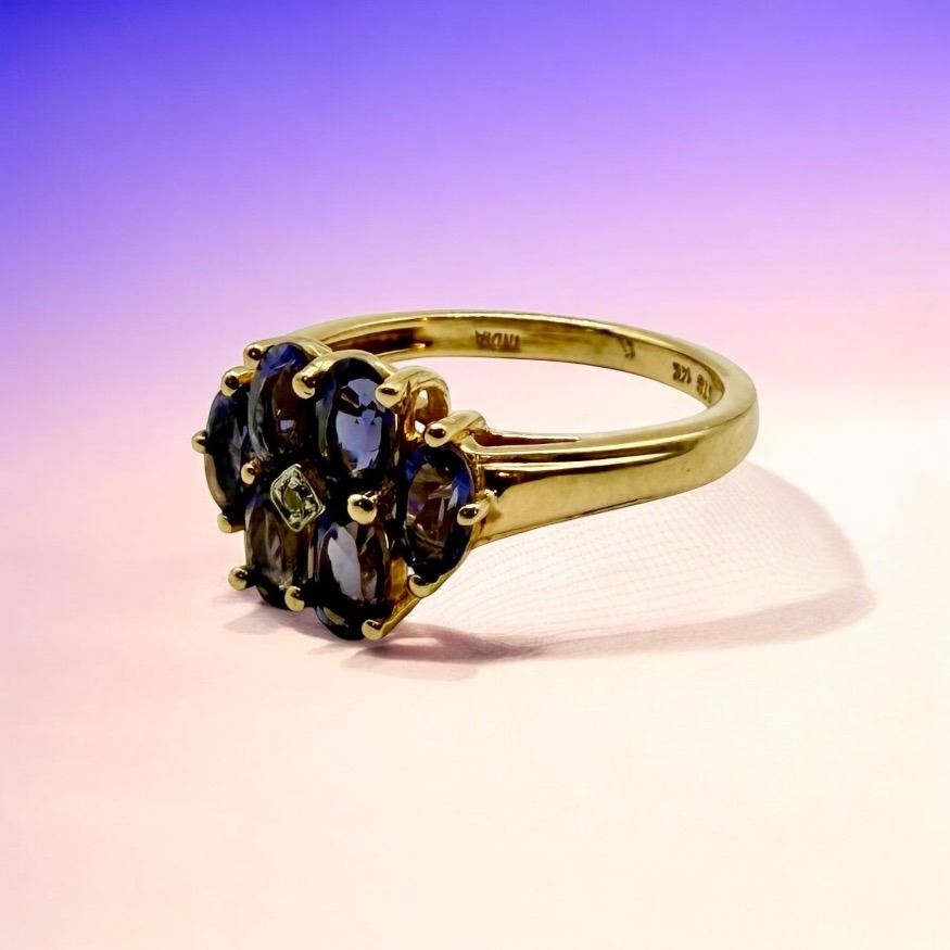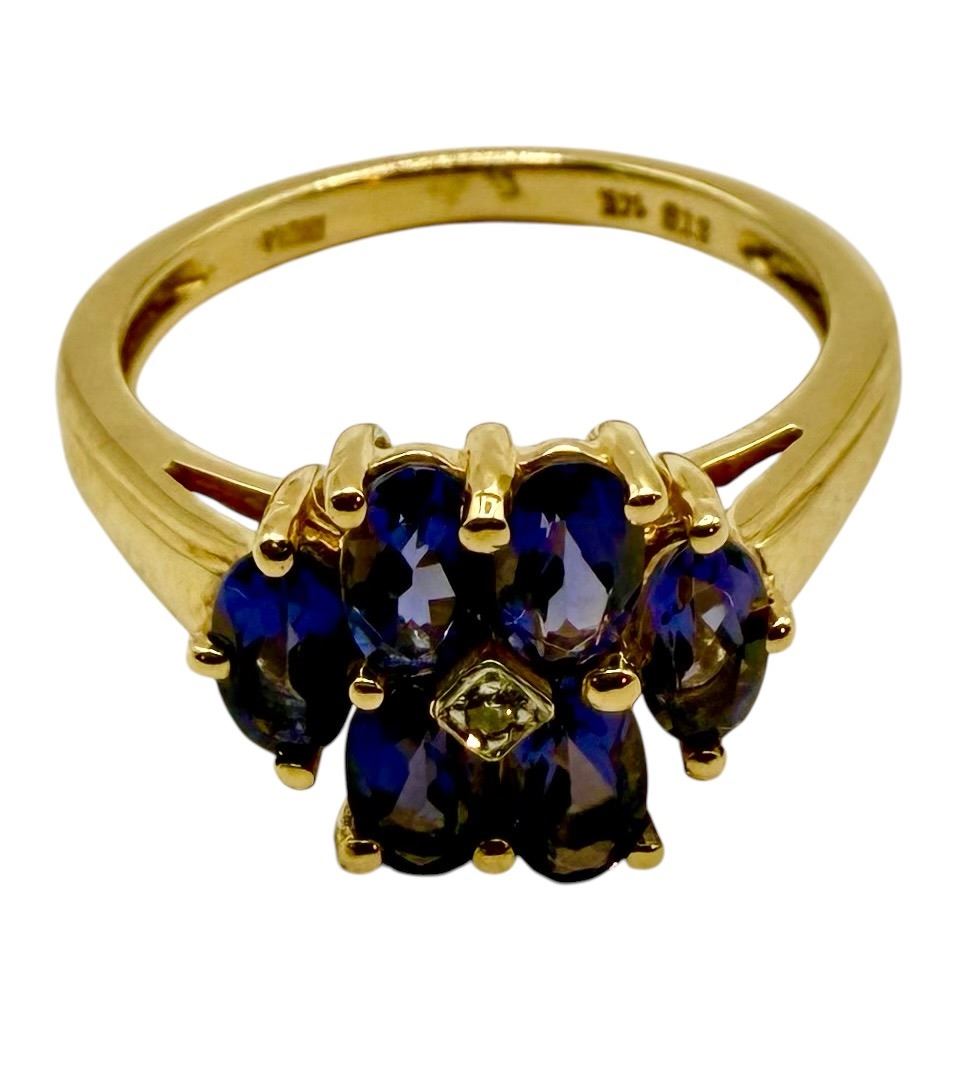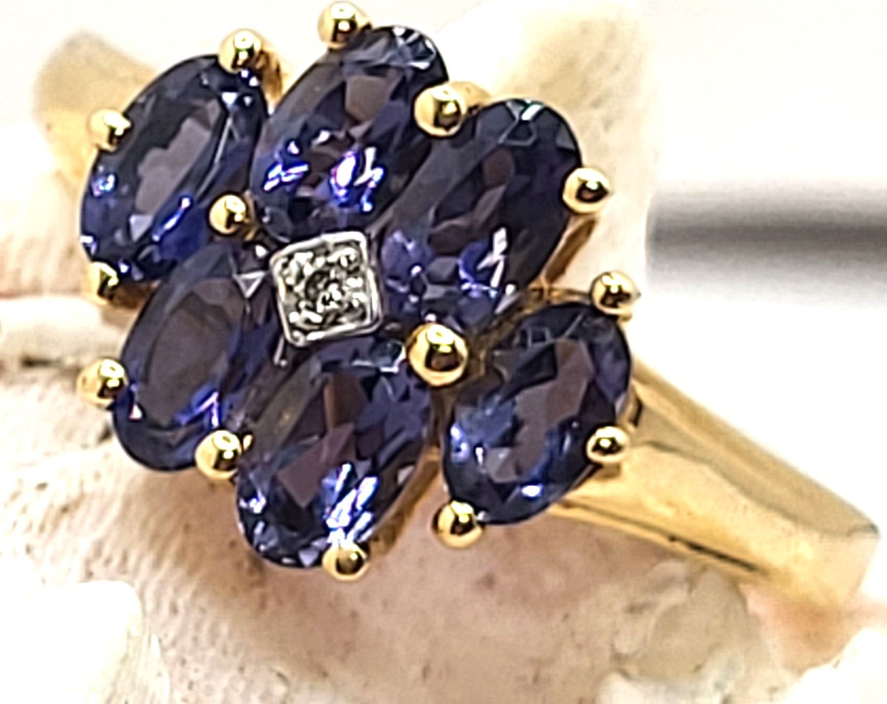 This 14 karat yellow gold ring features approximately 1.50 carats total weight of oval-cut, prong-set, genuine purple tourmalines in flower design, with a round, brilliant-cut accent diamond in the center.& nbsp; The ring is US size 7 and can be sized for an additional charge. The ring has smooth, polished cathedral shoulders that taper to an approximate 2.10 mm wide shank.& nbsp;& nbsp;