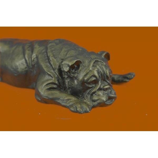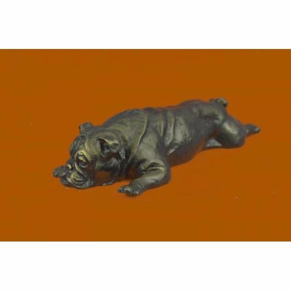 This adorable bronze sculpture shows the sweetest little bulldog lying on his belly sprawled out on the marble. With the cutest and very lifelike facial features this bronze is sure to add a touch of sweetness to your décor. You can see the folds of in his skin on his back as he lays down they look like a ripple effect in water. His short stubby paws are highlighted with bits of gold patina and so is his small curly tail. This is the perfect gift to give to the bulldog owner or lover in your life! This sculpture was cast using the lost wax method. Bronze dimensions: Height 2 X Width 7 inches. Weight: 1 lb.