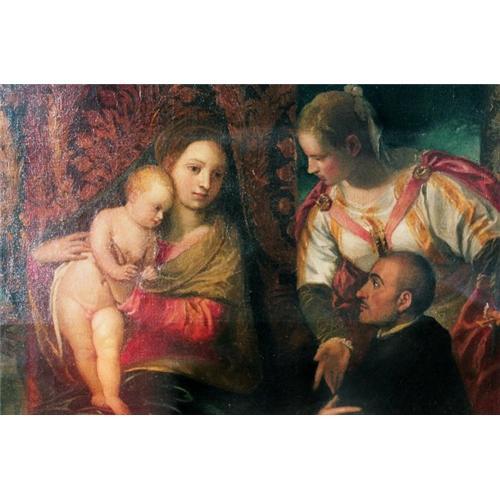 MAGNIFICENT, Extra-Large, Square formatted 19th.C copy of Titian's "Adoration Scene" with Mary holding the child Christ in a four figure grouping...Excellent painting by well-listed British painter E.Brown, with Beautiful, Ornate Gilt frame and liner, in restored original condition. Will be the star of any large wall in any well appointed, formal decorative environment.