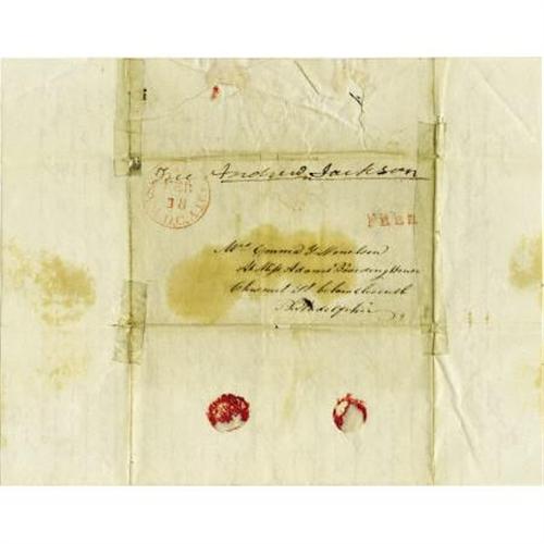 <B>Andrew Jackson Franking Signature</B></I> on the address sheet of an ALS by Sarah Yorke Jackson, 3 pages, 7.75” x 9.75”, Washington, D.C., February 16, 1837. The daughter-in-law of Seventh President Andrew Jackson, Sarah Yorke Jackson (1803-1887) served as unofficial First Lady of the United States from November 26, 1834, until March 4, 1837. (Jackson’s wife, Rachel, died two weeks after his election to the Presidency in 1828.) In this letter, mailed to her sister, Emma Donelson of Philadelphia, just two weeks before the end of Jackson’s second term, she refers to her sibling’s ill health and her desire <I>“to alleviate your stress in any way that may lay in my power.” </B></I>The letter, signed <I>“Sarah”</B></I>, is in good condition with several folds, stains, tears and small holes (though they do not affect the legibility of the text). Some cellophane tape was used to repair some tears to the verso (envelope side), which includes the mailing address of Emma Donelson and the remnants of the original wax seal.<BR><BR><b>Shipping:</b> Flat Material, Small (<a target="_blank" href="http://www.heritageauctions.com/common/shipping.php">view shipping information</a>)