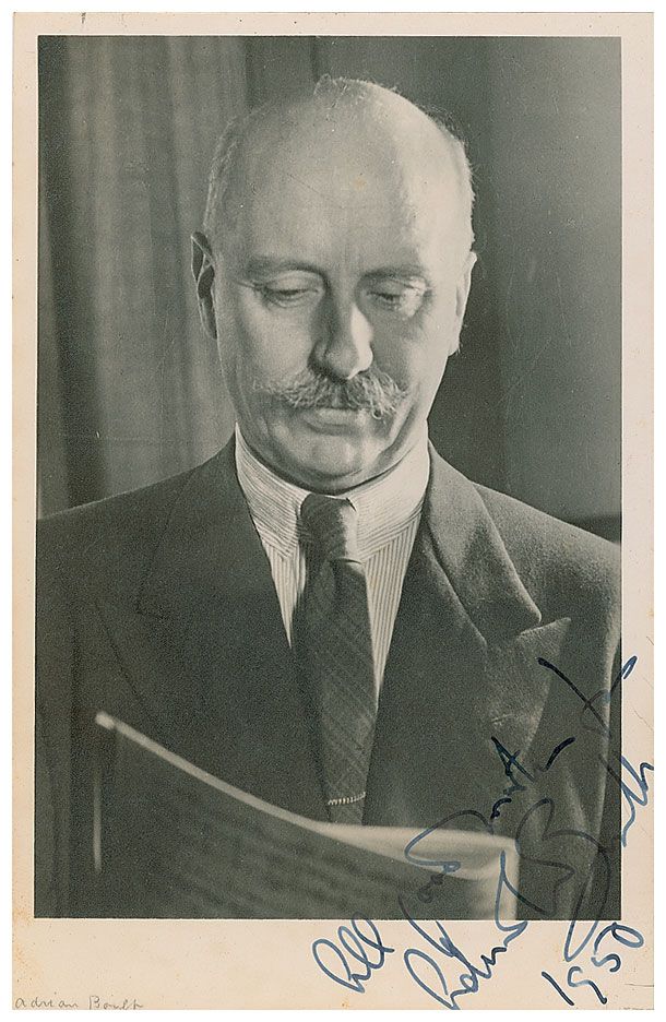 Conductor (1889–1983) best known for his championing of British music. Vintage matte-finish 3.5 x 5.5 photo, signed in fountain pen, “All good wishes from Adrian Boult.” In fine condition, with a bit of light foxing to lower border, small pencil notation to lower left and a bit of mild silvering to darker areas of image.