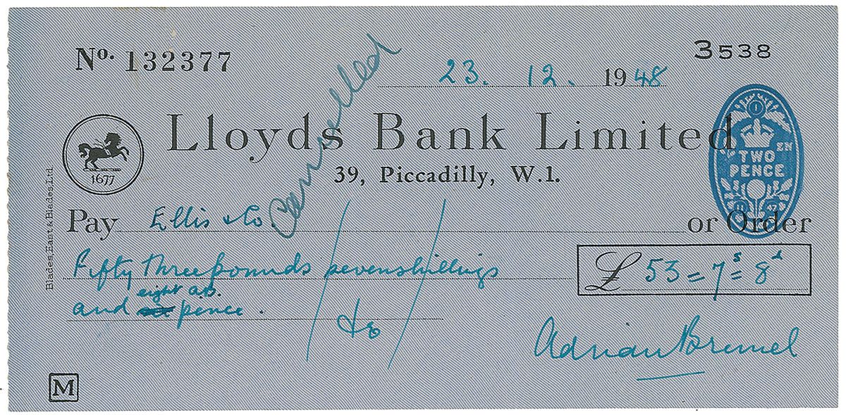 Innovative early director and screenwriter (1892–1958) known for his comedies. Bank check, 6 x 3, filled out and signed by Brunel, “Adrian Brunel,” payable to Ellis & Co. for £53.7.8, December 23, 1948. In fine condition, with expected bank notations.