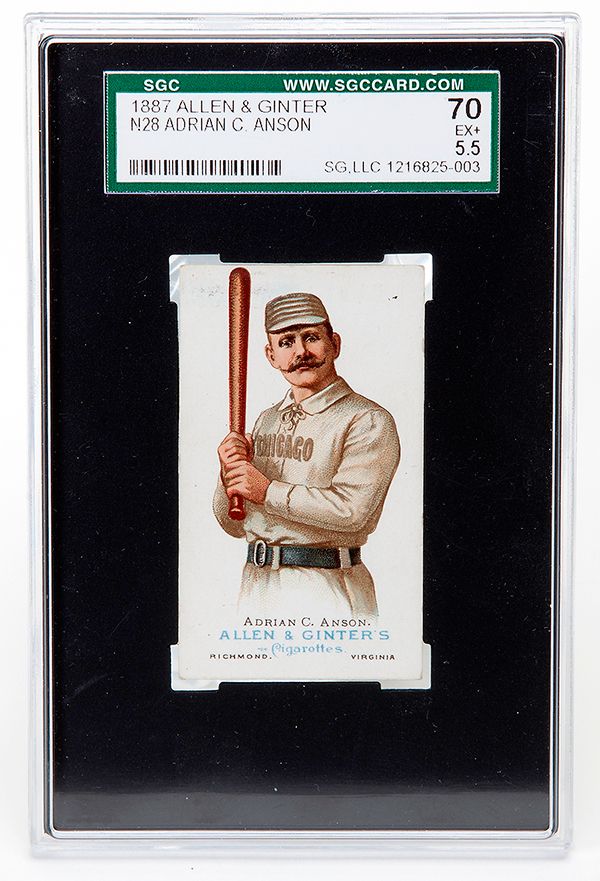 Adrian (Cap) Anson Baseball Card. Vintage baseball card measuring 2¾" x 1½" with reverse showing different catagories of sports athletes available in ten packs of cigerettes. Authenticated and encapsulated by SGC (Sports Card Guaranty) Condition 70 EX+ 5.5. Excellent 5.