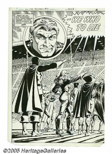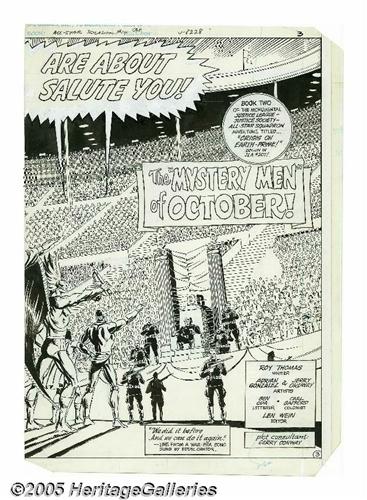 <B>Adrian Gonzales and Jerry Ordway - All-Star Squadron #14, Splash Page 2 and 3 Original Art (DC, 1982).</B></I> Per Degaton has altered world history, and brought the Justice League of America, the Justice Society of America and the All Star Squadron together to battle the villains of Earth 3. This majestic double page spread is from Book Two of the monumental adventure, "Crisis on Earth-Prime!," which began in <B>Justice League of America</B></I> #207. The All Stars face Degaton sitting on his granite throne, against a panoramic coliseum full of people, in page 2 and 3 of "The 'Mystery Men' of October," written by Roy Thomas. The image area measures 21" x 15". The edges have been trimmed in the printing process, otherwise the art is in Excellent condition.