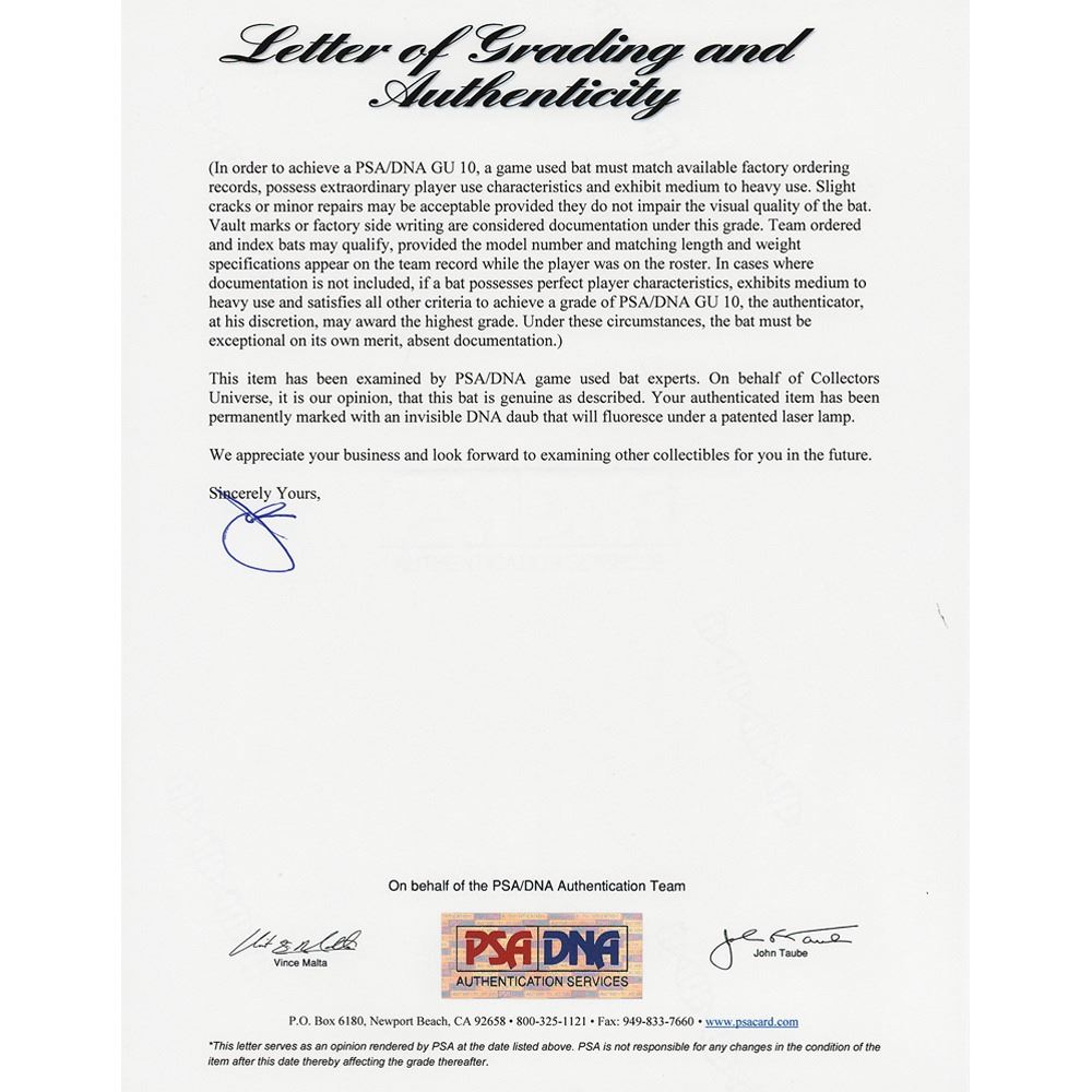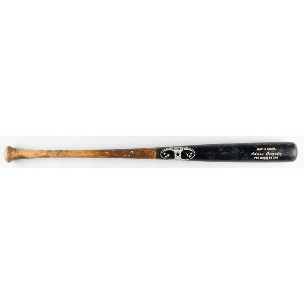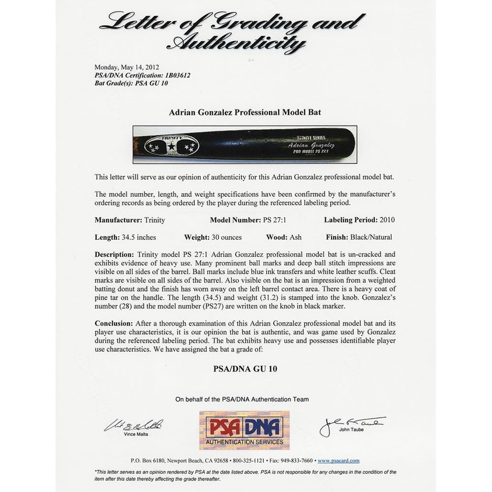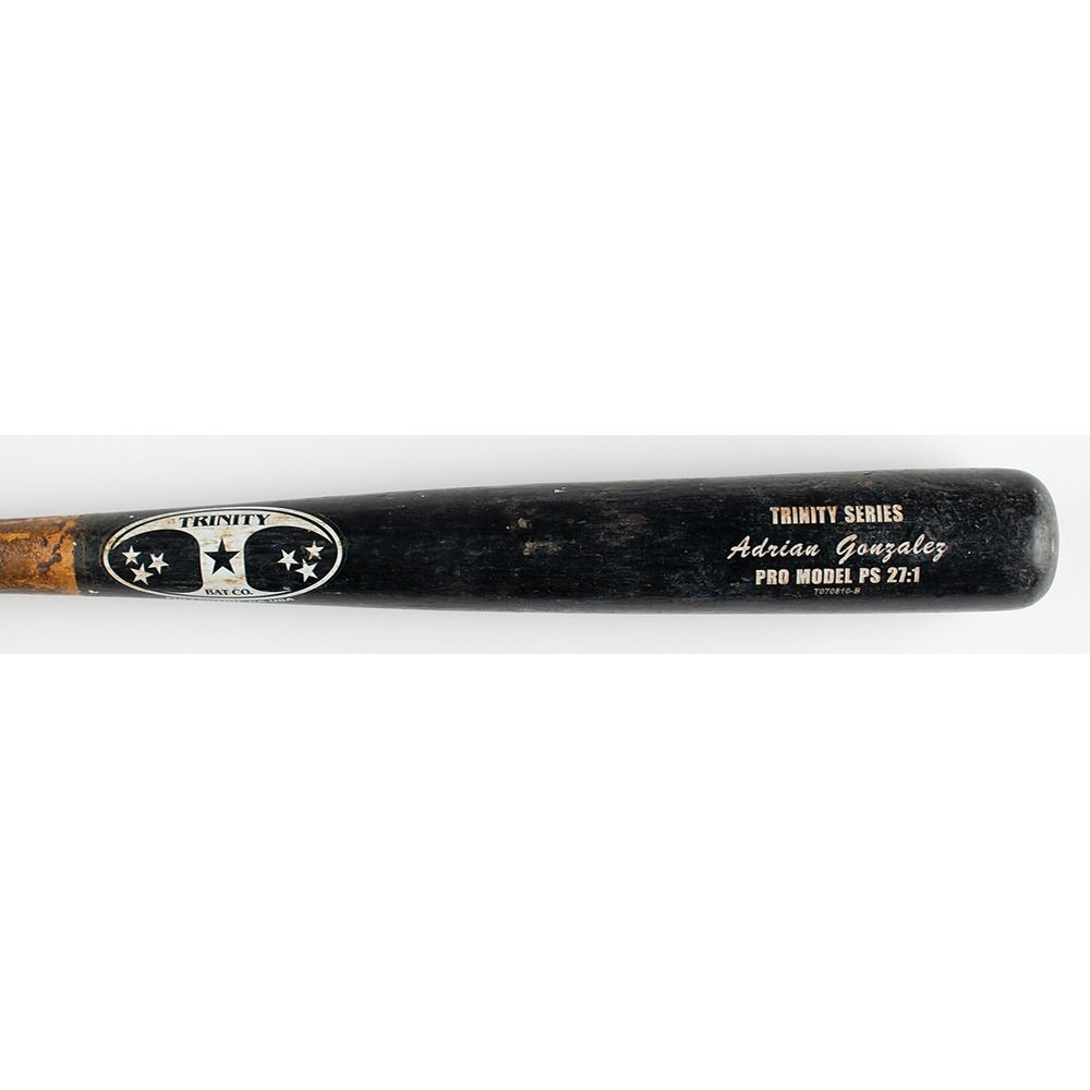 Adrian Gonzalez’s game-used personalized Trinity Pro MOdel PS 27:1 baseball bat, used by Gonzalez as a member of the San Diego Padres during the 2010 season. The end of the knob is marked with Gonzalez’s Padres uniform number, “28.” In very good to fine condition, with obvious expected signs of use, such as ball and cleat marks, and stitch impressions. Accompanied by a full letter of authenticity from PSA/DNA, which grades the bat as “PSA/DNA GU 10” and concludes that “the bat is authentic, and was game used by Gonzalez during the referenced labeling period.” From the time he entered the big leagues, Gonzalez proved himself to be a perennial MVP candidate, and 2010 was no different. He earned his 3rd consecutive All-Star selection with a .298 batting average, 176 hits, 33 doubles, 31 home runs, and 101 RBIs.
