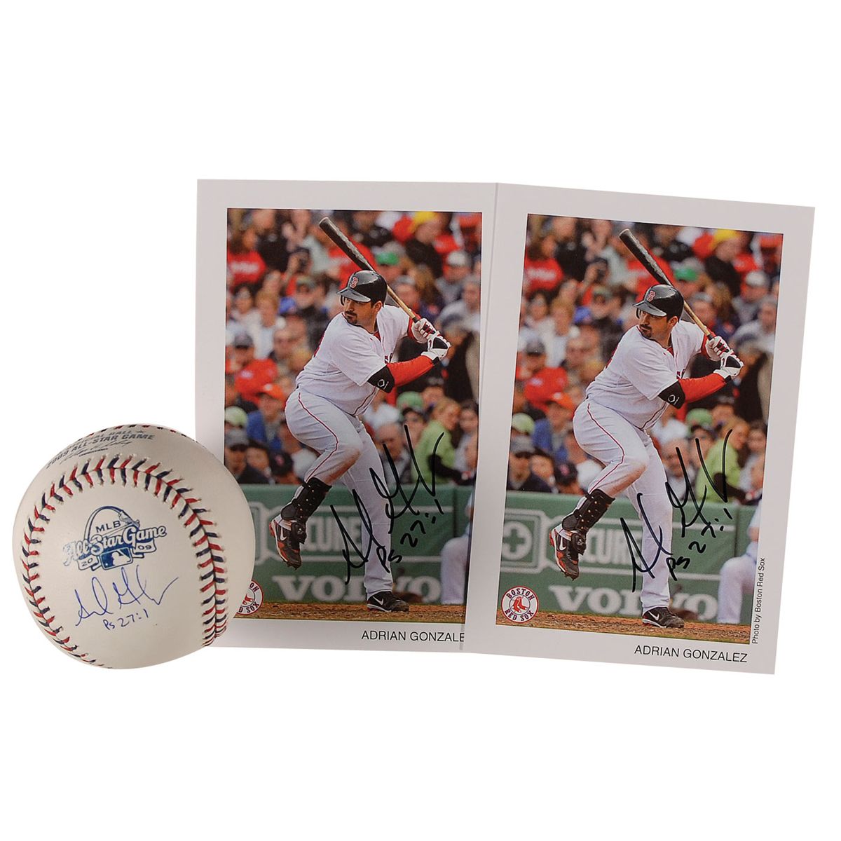 Three items: official Rawlings 2009 All Star Game baseball, signed on a side panel in blue ballpoint, “Adrian Gonzalez PS 27:1”; and two identical color 4 x 6 team-issued photos of Gonzalez at bat for the Red Sox, each signed in black felt tip, “Adrian Gonzalez PS 27:1.” In fine condition, with a PSA/DNA authentication label affixed to ball.