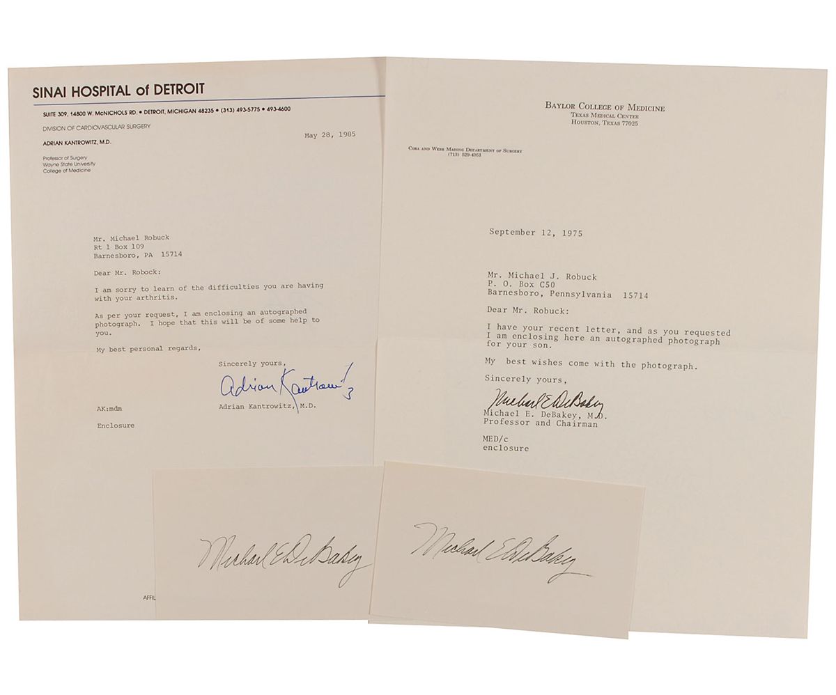Four items: one TLS signed “Adrian Kantrowitz,” one page, 8.5 x 11, Sinai Hospital of Detroit letterhead, May 28, 1985, responding to an autograph request; one TLS signed “Michael E. DeBakey,” one page, 8.5 x 11, Baylor College of Medicine letterhead, September 12, 1975, responding to an autograph request; and two black ink signatures, “Michael E. DeBakey,” on individual off-white 5 x 3 cards. In overall fine condition.