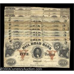 <TABLE cellSpacing=0 cellPadding=0 width="100%" bgColor=#000000 border=0><TBODY> <TR><TD width="100%"><TABLE cellSpacing=1 cellPadding=3 width="100%" border=0><TBODY><TR><TD width="100%" bgColor=#79735c><FONT face=arial color=#ffffff size=3><B>Description</B> </FONT></TD></TR><TR><TD width="100%" bgColor=#ffffff><FONT face=arial size=2><B>Adrian, MI - Erie and Kalamazoo Rail Road Bank</B></I><BR>A small hoard of $5 notes<BR>$5 Apr. 29, 1853 G32a Lee ADR 3-34 Fine<BR>$5 Apr. 29, 1853 G32a Lee ADR 3-35 VG, wormholes<BR>$5 Apr. 29, 1853 G32a Lee ADR 3-36 VF<BR>$5 June 1, 1853 G32a Lee ADR 3-37 Fine<BR>$5 Aug. 1, 1853 G34b Lee ADR 3-38 VG<BR>$5 Aug. 1, 1853 G34b Lee ADR 3-39 VF<BR>$5 Aug. 1, 1853 G34b Lee ADR 3-40 VG<BR>$5 Aug. 1, 1853 G34a Lee ADR 3-41 VG<BR>$5 Aug. 1, 1853 G34a Lee ADR 3-42 (3), VG (1), Fine (2)<BR>$5 Aug. 1, 1853 G34c Lee ADR 3-45 Unc.<BR>$5 Aug. 1, 1854 G34c Lee ADR 3-48 Fine<BR>$5 Aug. 1, 1854 G34c Lee ADR 3-49 Fine. (350-450 ) (14 notes) </FONT></TD></TR></TBODY></TABLE></TD></TR></TBODY></TABLE><BR><TABLE cellSpacing=0 cellPadding=0 width="100%" bgColor=#000000 border=0><TBODY><TR> 14 notes Important notice: Heritage usually auctions material at the rate of 200-250 lots per hour. On some occasions eBay Live bid software or the Internet may not be able to keep up with the pace of the auction. We recommend placing a realistic absentee bid now as insurance to avoid disappointment. Occasionally the auctioneer may eliminate or reject an eBay Live bid, and the auctioneer may also reopen a lot after the close of the eBay live bidding (usually because we missed an audience bid), and may reject your bid even if it shows you as the winning bidder. By bidding via eBay Live, you agree that Heritage may award the lot to another bidder at its sole discretion under the circumstances described above or any other reasonable circumstances. Also please note that all Heritage lots purchased through eBay Live carry a 20% Buyer's Premium. Please make sure you read the Terms and Conditions before you bid.</TR></TBODY></TABLE>