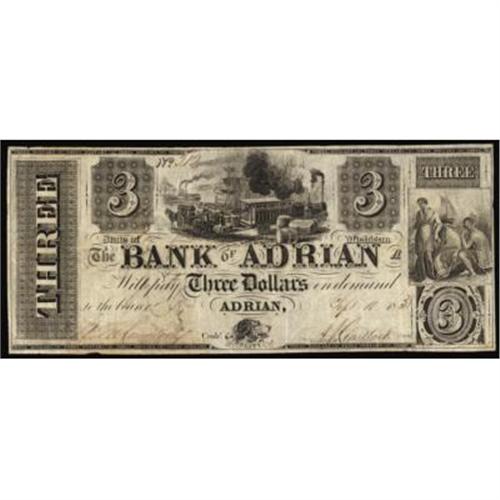 Adrian, MI. The Bank of Adrian. September 10, 1838. $3. Very Fine.