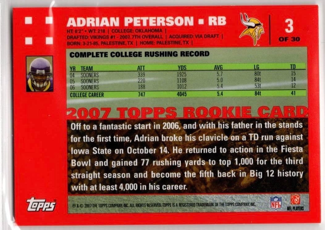 Adrian Peterson 2007 Topps Exclusive Rookies White Border Rookie Card #3