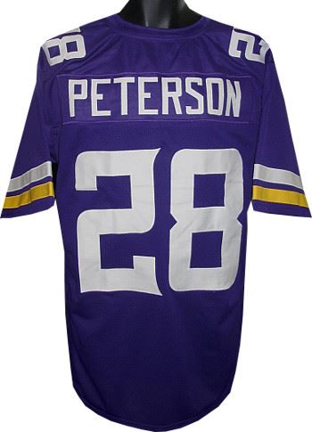 Adrian Peterson was selected by the Vikings with the seventh overall pick in the first round of the 2007 NFL Draft. He played college football at the University of Oklahoma. Following his stellar first pro season in which he set an NFL record for most rushing yards in a single game (296), Peterson was named the NFL Offensive Rookie of the Year. Peterson was then awarded the MVP award for his performance in the Pro Bowl and became only the fifth player in NFL history to have more than 3,000 yards through his first two seasons.This is an Adrian Peterson Minnesota Vikings unsigned Purple unlicensed custom-prostyle jersey with twill stitched nameplate and numbers. perfect for autograph or to wear! Size XL