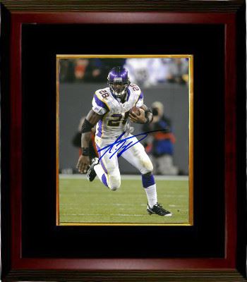Adrian Peterson was selected by the Vikings with the seventh overall pick in the first round of the 2007 NFL Draft. He played college football at the University of Oklahoma. Following his stellar first pro season in which he set an NFL record for most rushing yards in a single game (296), Peterson was named the NFL Offensive Rookie of the Year. Peterson was then awarded the MVP award for his performance in the Pro Bowl and became only the fifth player in NFL history to have more than 3,000 yards through his first two seasons. Adrian Peterson has hand autographed this Minnesota Vikings 8x10 Photo. Certificate of Authenticity from Athlon Sports. Custom Black Mat and Premium Mahogany Frame as shown.