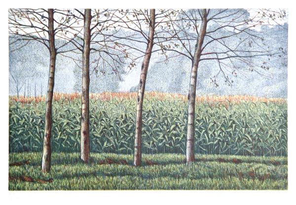 Adrian Yau, Birches and Cornfields, Aquatint Etching