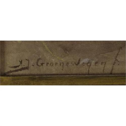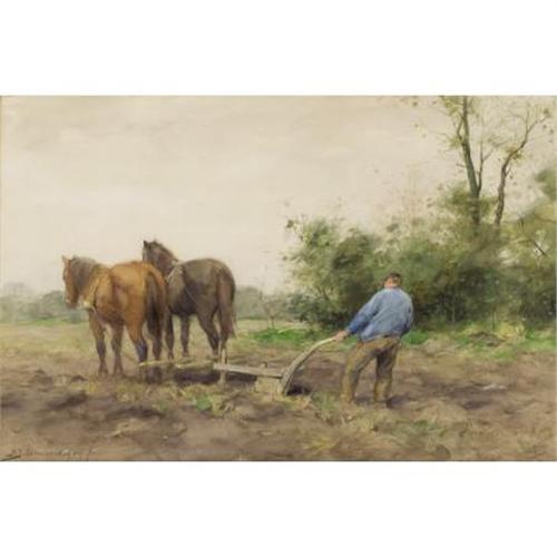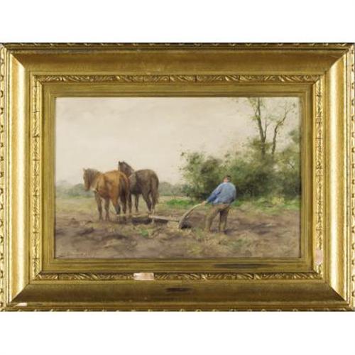 <B>ADRIANUS JOHANNES GROENEWEGEN (Dutch, 1874-1963)</B></I><BR><I>Plowing the Field</B></I><BR>Watercolor on paper<BR>13-1/4 x 20-1/4 inches (33.7 x 51.4 cm)<BR>Signed lower left:<I> A.J. Groenewegen f.</B></I><BR> <B>Condition Report:</B> Normal wear commensurate with age; not examined outside the frame.<BR><BR><b>Shipping:</b> Framed - with Glass, Medium (<a target="_blank" href="http://www.heritageauctions.com/common/shipping.php">view shipping information</a>)