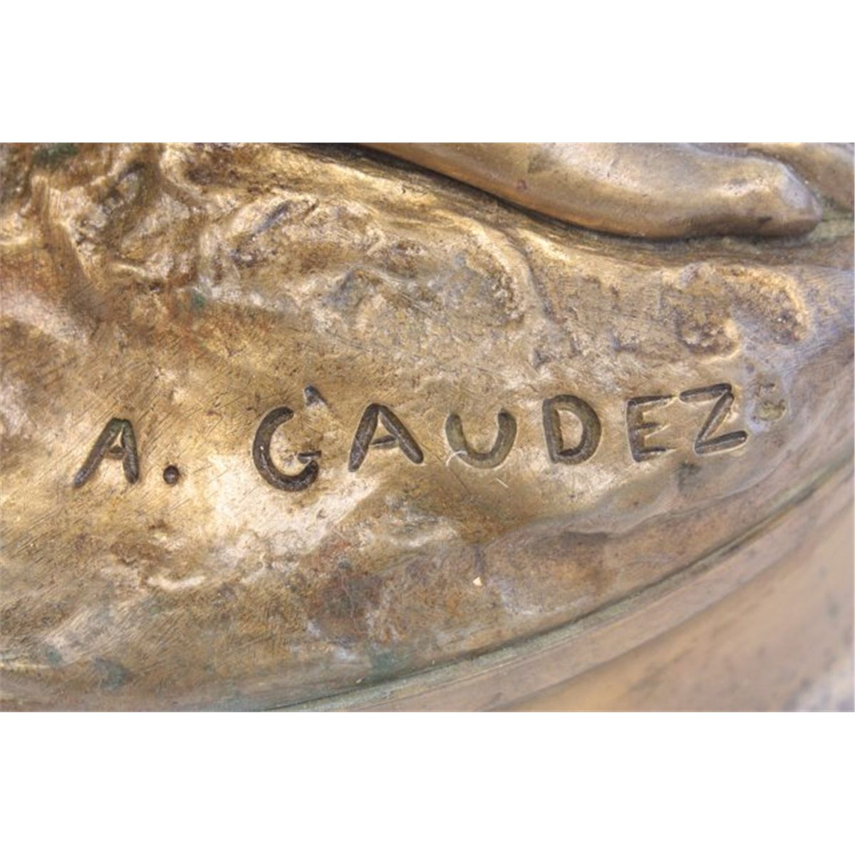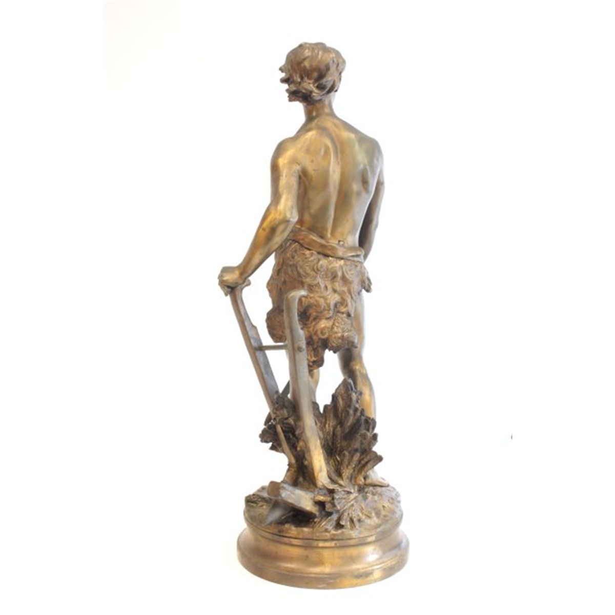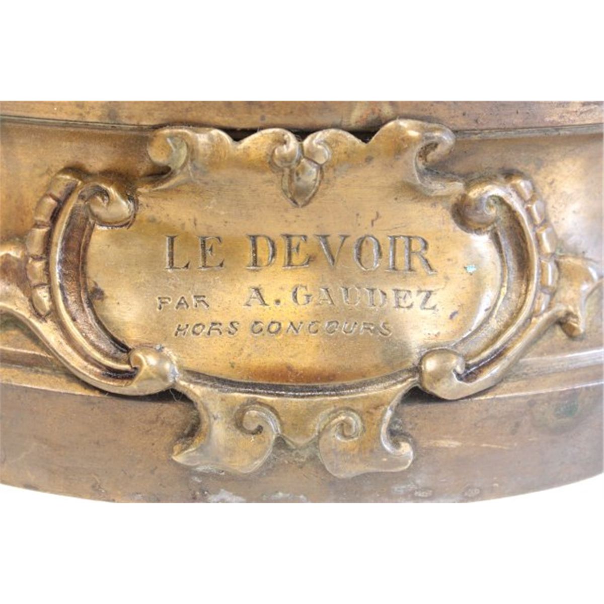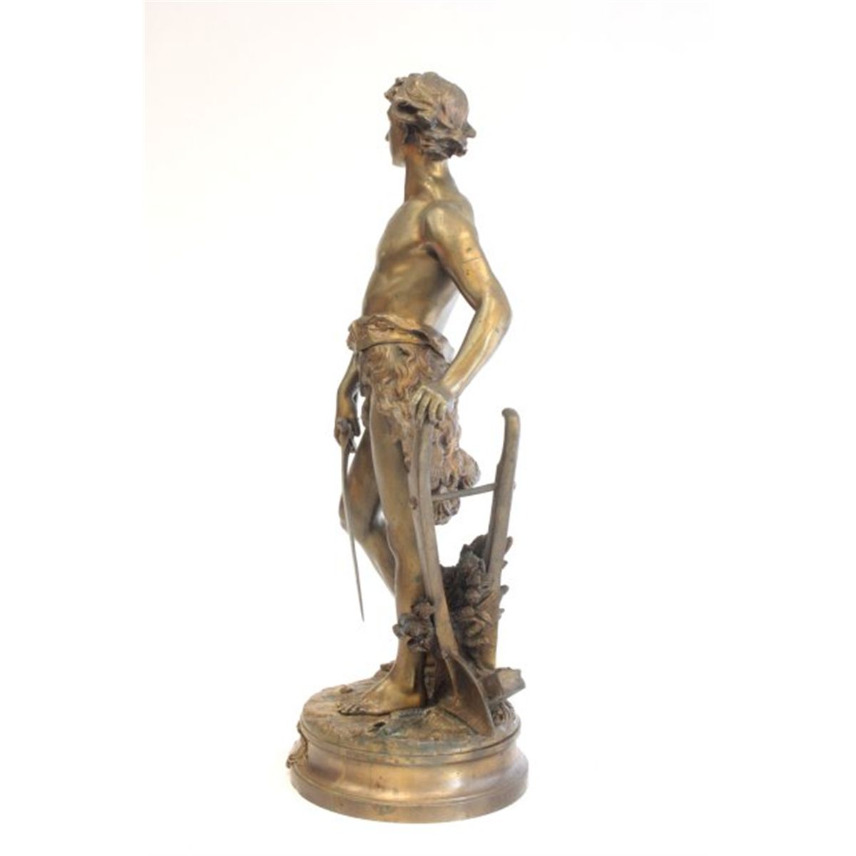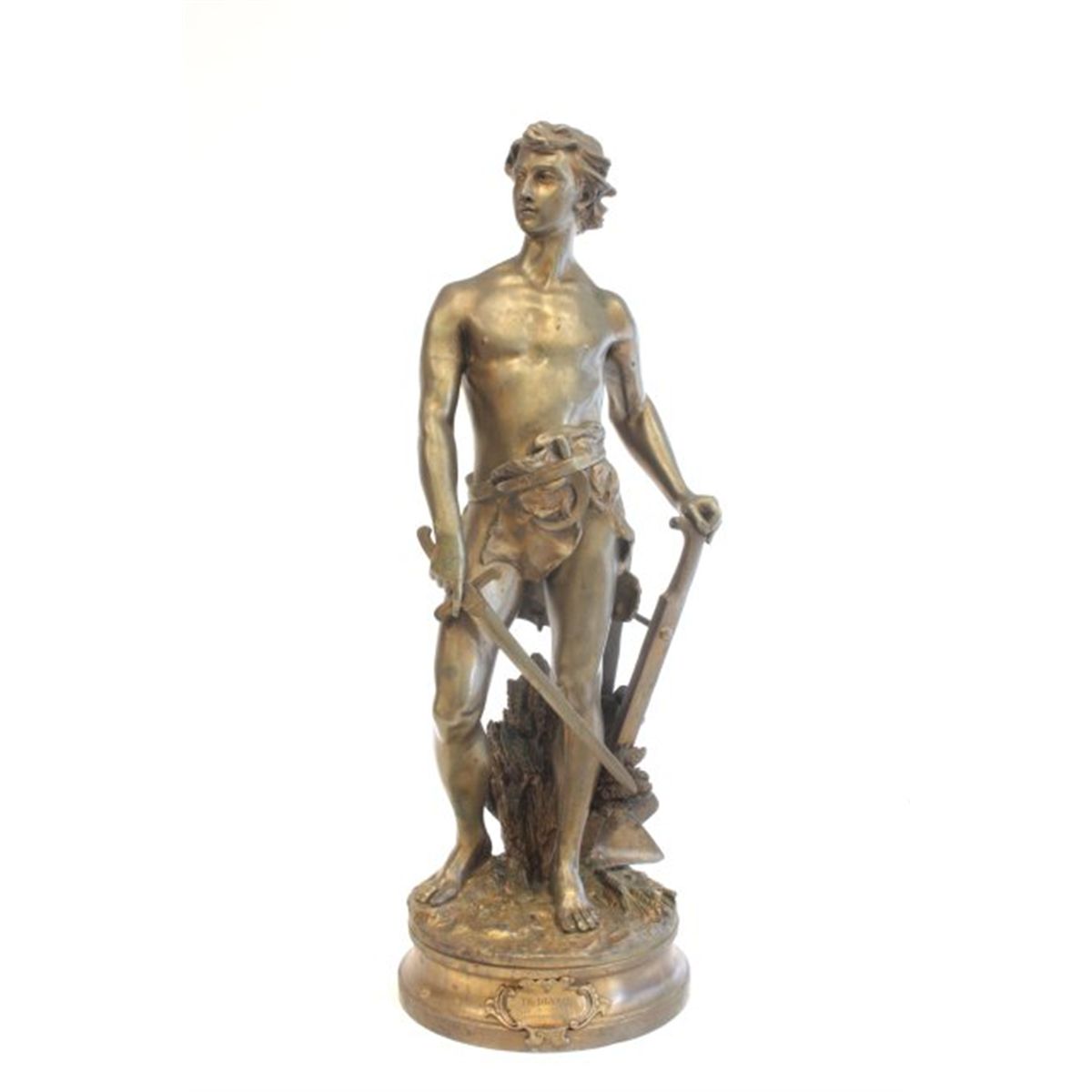 Andrien Etienne Gaudez (1845-1902 France) "Le Devoir" bronze sculpture of a semi nude male with a sword and a plow, signed on base, original plaque on base with A. Gaudez, title and "Hors Concours"