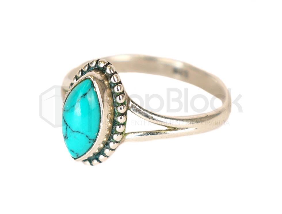 Ring worn by the character of Tami Oldham, actress Shailene Woodley in the 2018 thriller Adrift. Tami Oldham and Richard Sharp couldn't anticipate that they would be sailing directly into one of the most catastrophic hurricanes in recorded history. In the aftermath of the storm, Tami awakens to find Richard badly injured and their boat in ruins. With no hope of rescue, Tami must now find the strength and determination to save herself and the only man she has ever loved. This piece was worn by the main character band is made of silver metal with an oval turquoise gemstone set in the middle. This piece shows slight wear on the patina of the metal but remains in excellent, production used condition.